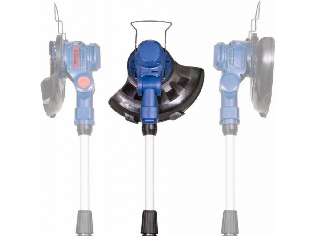 Konstrukce: ergonomicky tvarovaná rukojeť, 2bodový bezpečnostní spínač, výškově nastavitelné přídavné madlo, ochranný kryt vč. distančního oblouku.