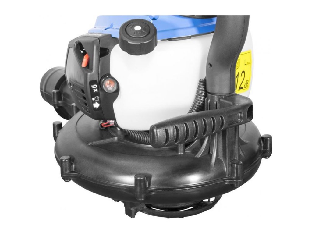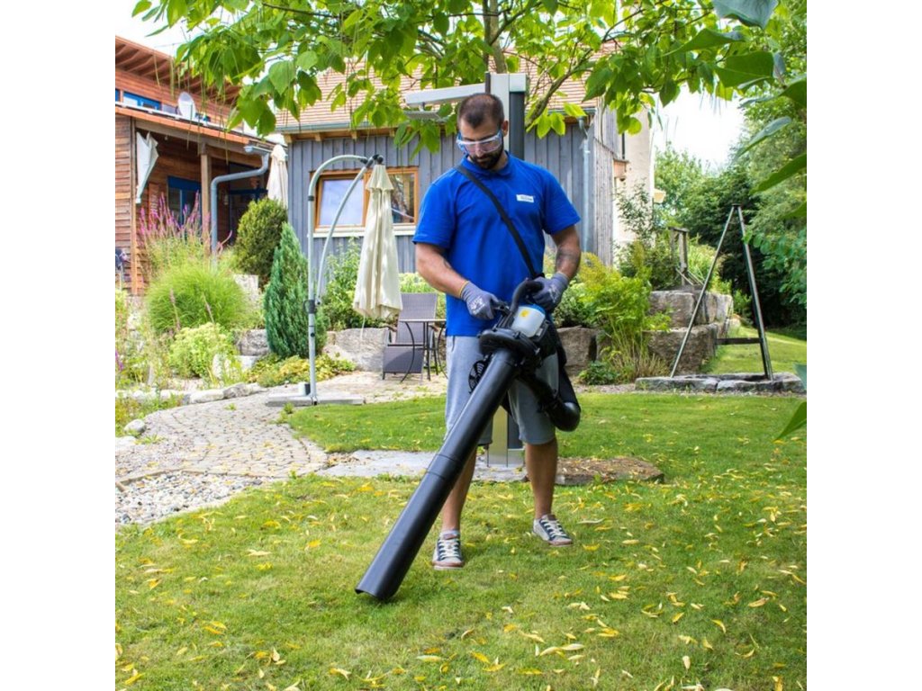 Benzinový vysavač, určený k odstranění rostlinného odpadu ze zahradních trávníků i zpevněných ploch okolo domu.