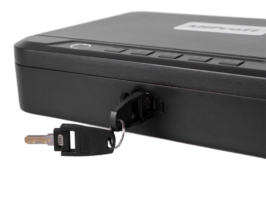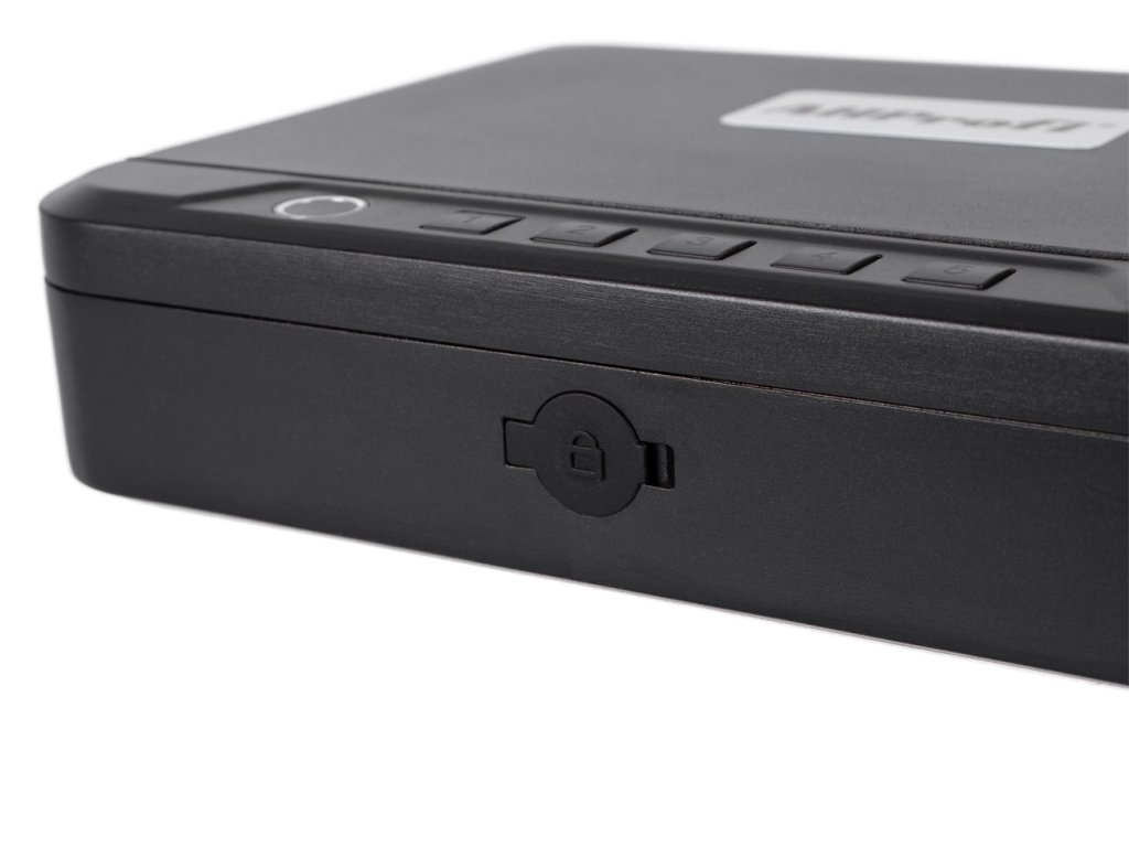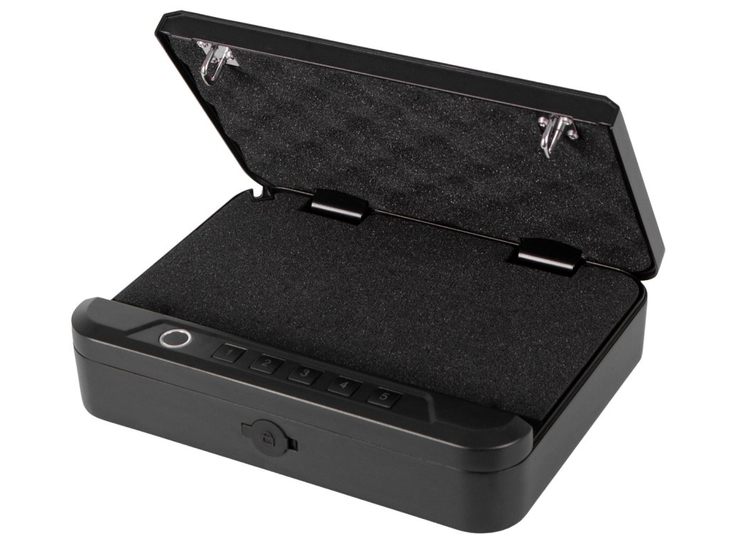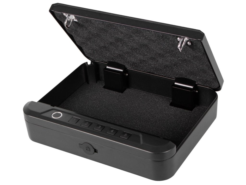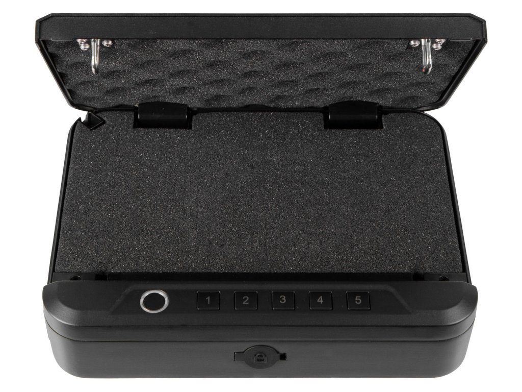 Víko je odolné proti vypáčení a celý trezor je vyroben s ohledem na odolnost. Dvojité západky proti nárazu ho udržují bezpečně uzavřený. Vyrobeny ze silné hliníkové slitiny.