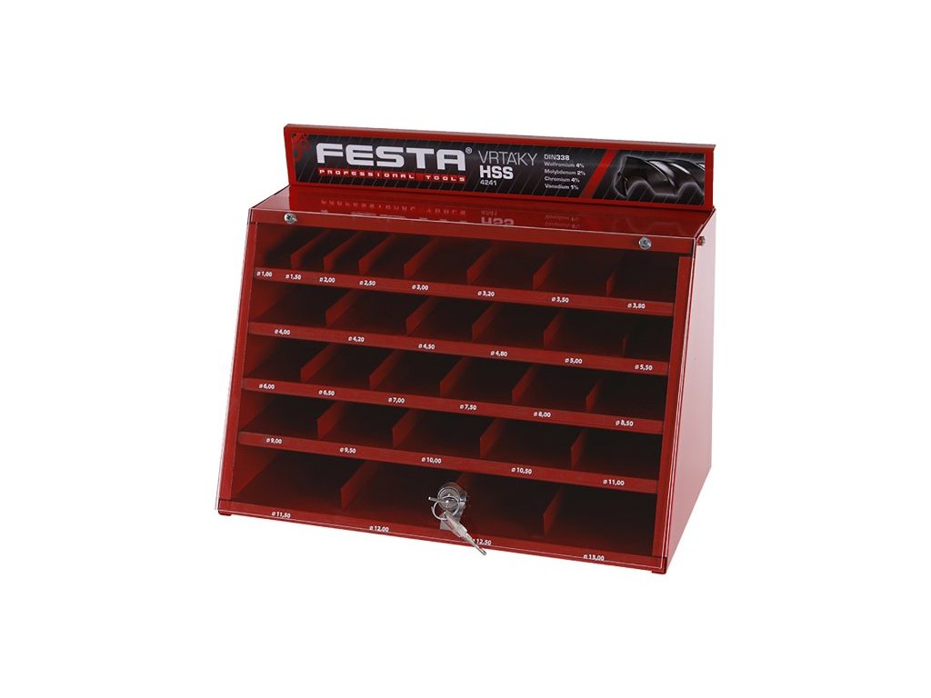 Plechový box pro přehledné uspořádání vrtáky HSS 4241 s průhlednou čelní stěnou, uzamykatelný na klíček. Box je plně osazen nejprodávanějšími profi vrtáky.Doplňkové parametry