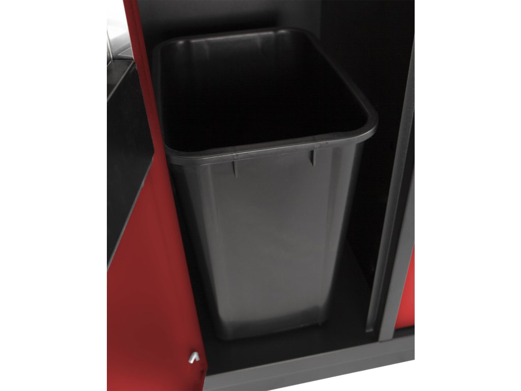 Celokovová dílenská skříňka. Skříňka obsahuje odpadkový koš a držák na role papíru, je vhodná do profesionálních servisů, dílen, ale také do garáží.
