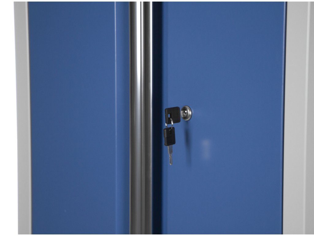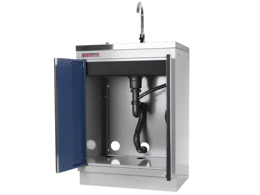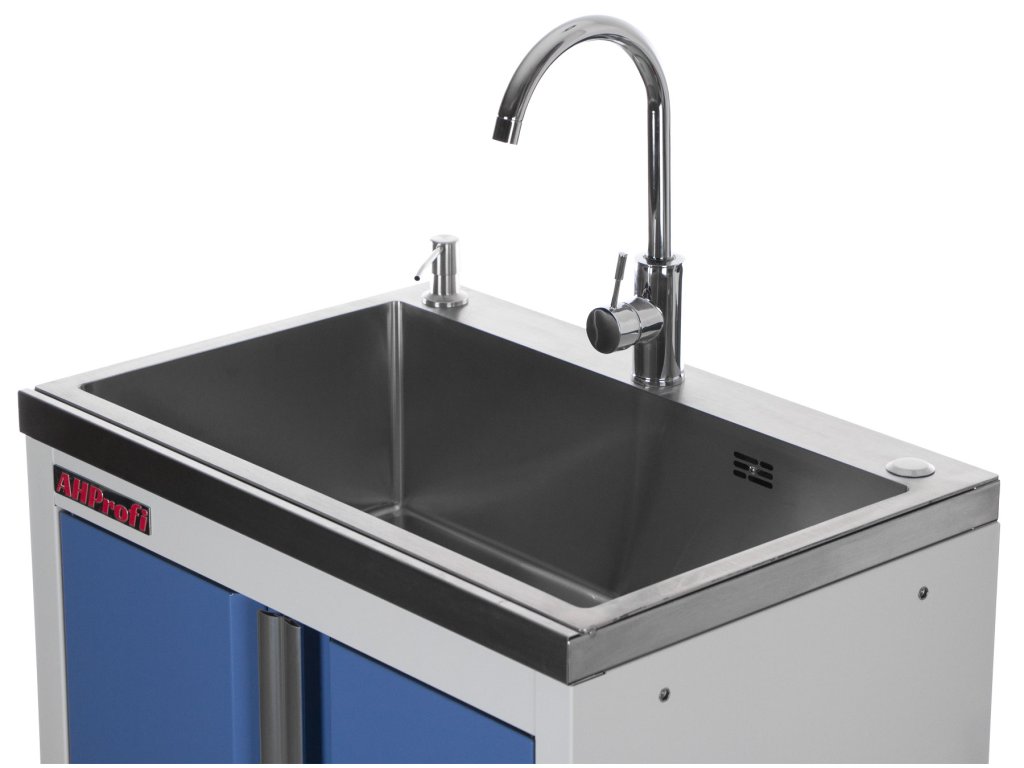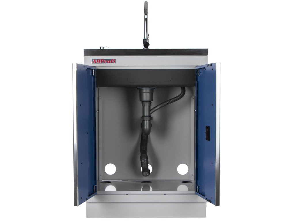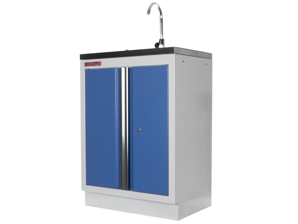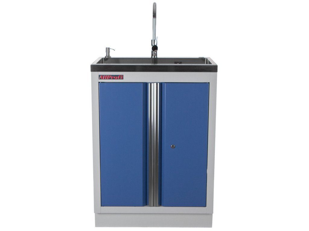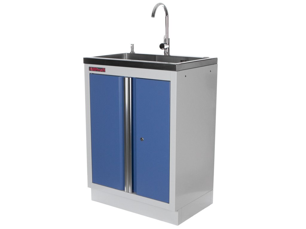 Celokovová PROFI BLUE dílenská dvoukřídlá skříňka s vestavěným nerezovým dřezem a baterií.