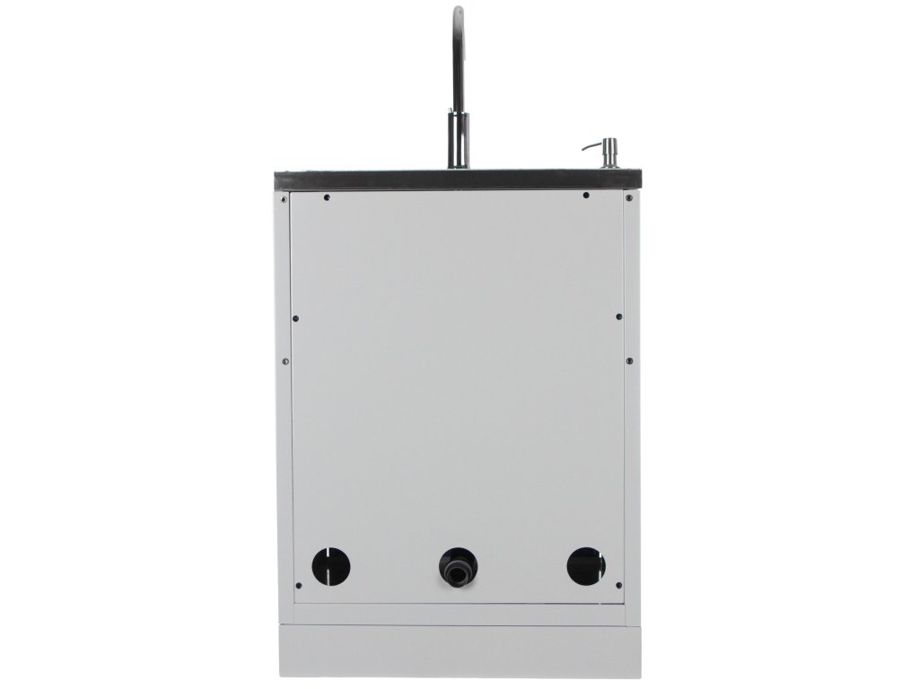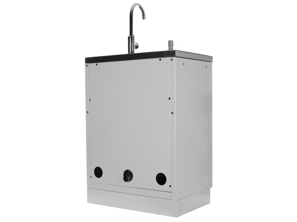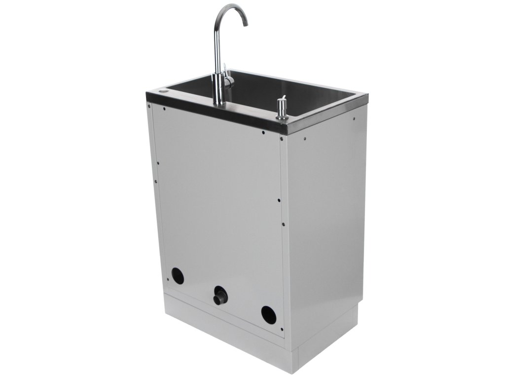 Kompletně vybavená skříňka s baterií, kterou lze umístit do jednoho z rohů nebo doprostřed nerezového dřezu.