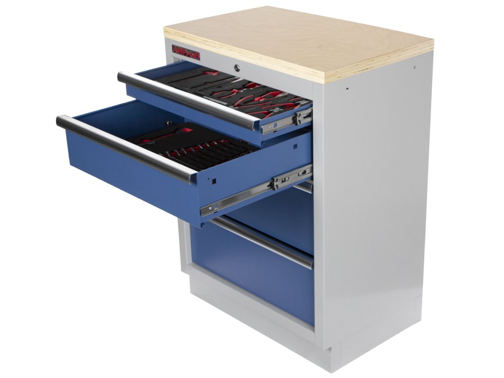 Rozměr zásuvek: 1x úzká zásuvka 570 x 400 x 70 mm, 1x střední zásuvka 570 x 400 x 150 mm, 2x široká zásuvka 570 x 400 x 225 mm.
