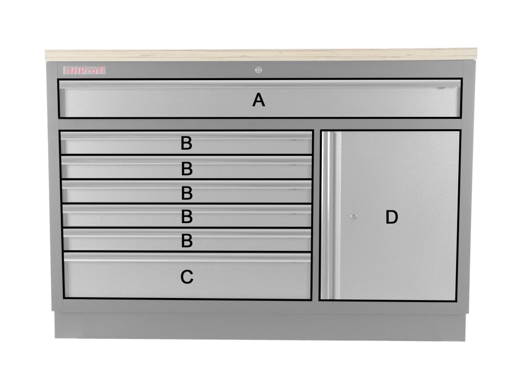 Na levé straně je celkem 6 zásuvek, které se hodí zejména pro ruční nářadí nebo výplně s nářadím, do spodní hlubší zásuvky lze uskladnit i větší nářadí.