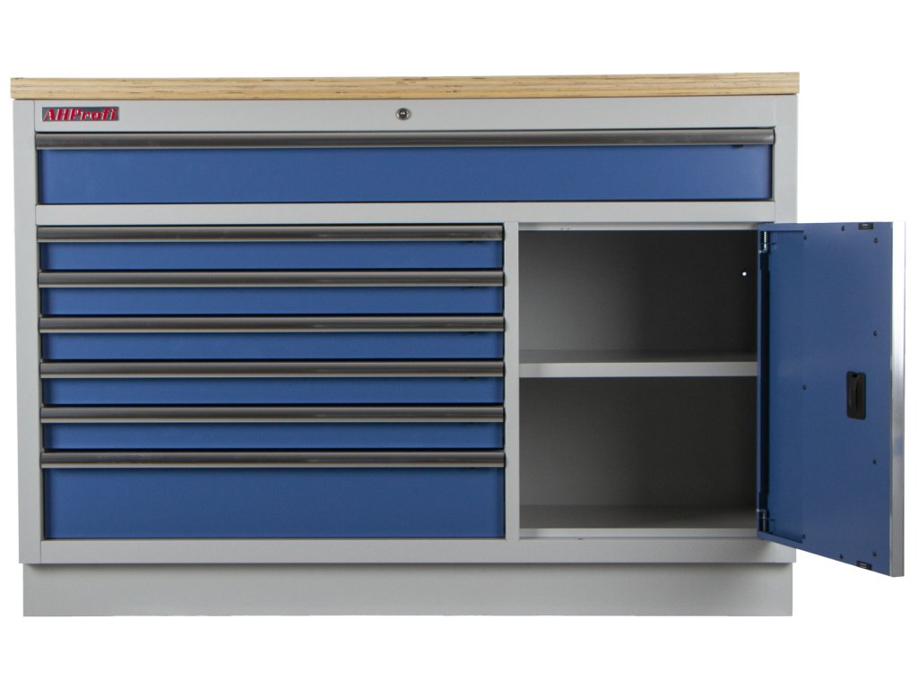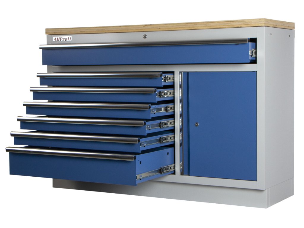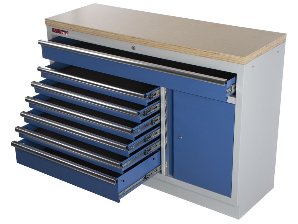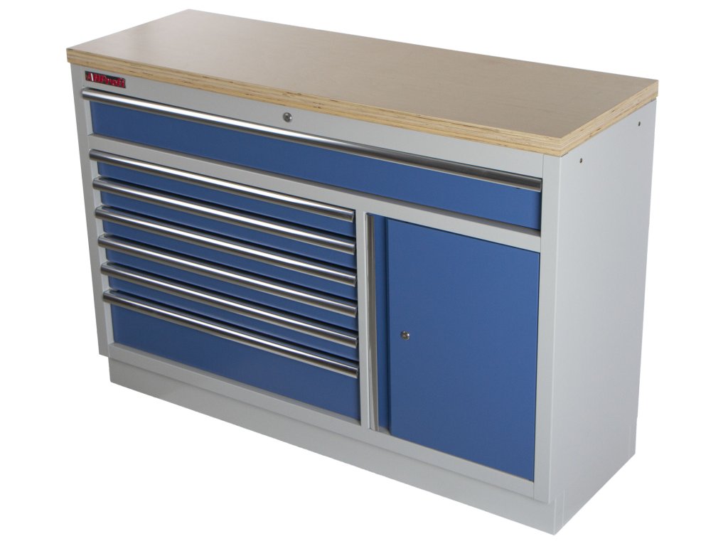 Široká celokovová dílenská skříňka se 7 zásuvkami, skříňkou a dřevěnou pracovní deskou.