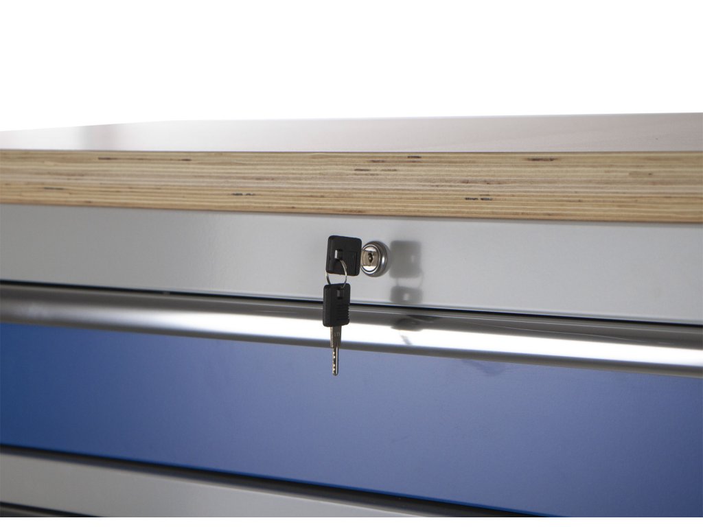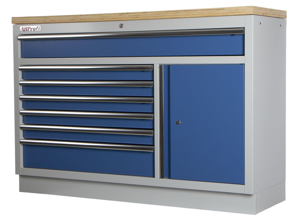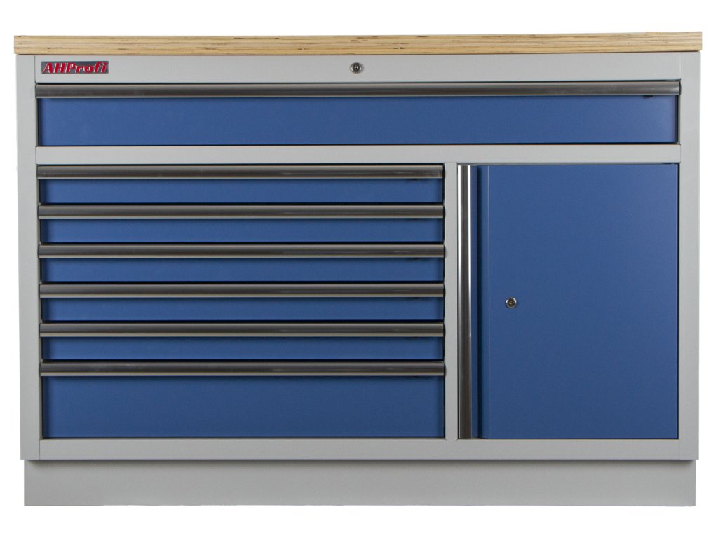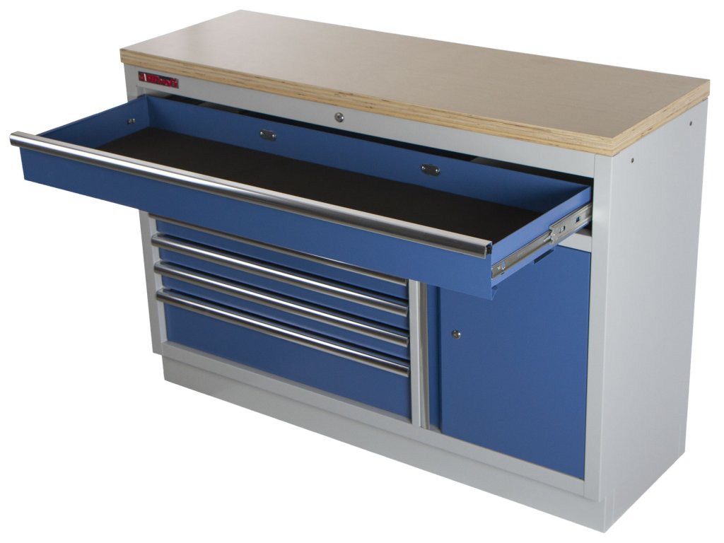 Široká celokovová dílenská skříňka se 7 zásuvkami, skříňkou a dřevěnou pracovní deskou.