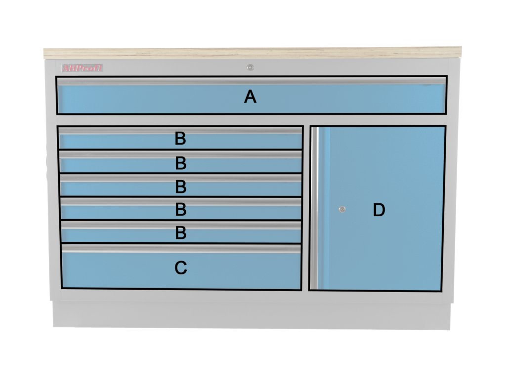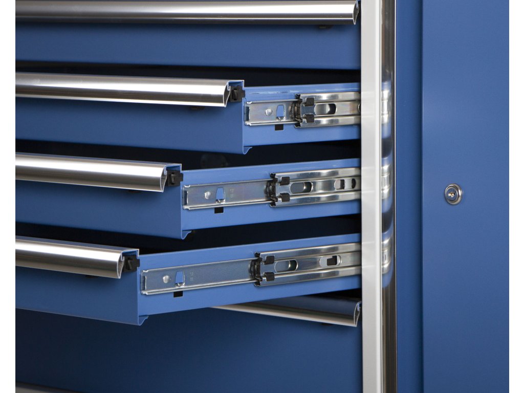 Na levé straně je celkem 6 zásuvek, které se hodí zejména pro ruční nářadí nebo výplně s nářadím, do spodní hlubší zásuvky lze uskladnit i větší nářadí.