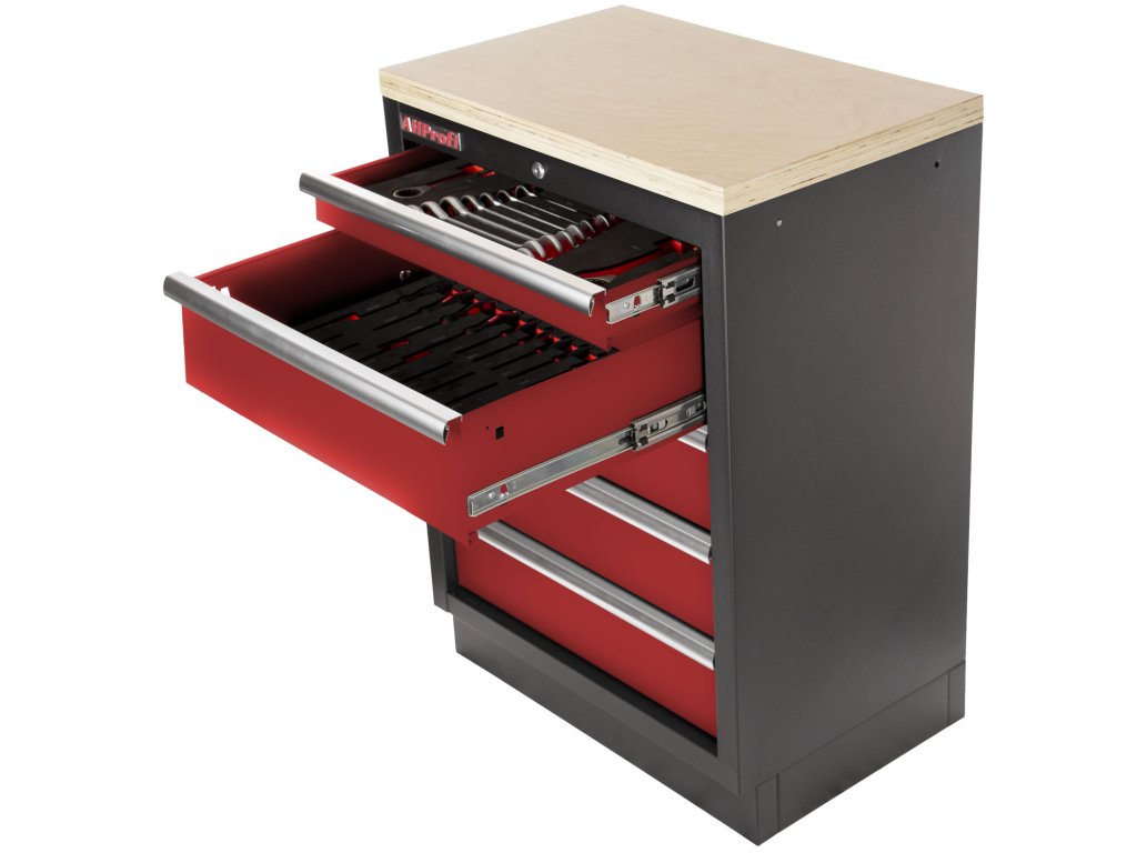 Rozměr zásuvek: 1x úzká zásuvka 570 x 400 x 70 mm, 4x široké zásuvky 570 x 400 x 150 mm.