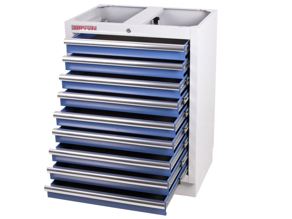 Celokovová PROFI dílenská skříňka s 9-ti zásuvkami. Prodává se i v rámci kvalitní PROFI 10ks sestavy dílenského nábytku TGS1300 nebo menších sestavách. Skříňka je vhodná do profesionálních servisů, dílen, ale také do garáží pro uskladnění širokého sortimentu zboží i ručního nářadí, na které se pak nepráší a snáze se udrží přehledně uklizené na správném místě.