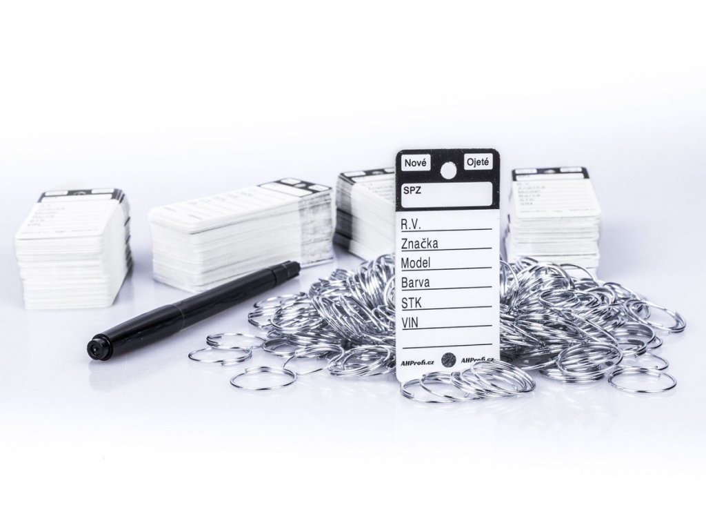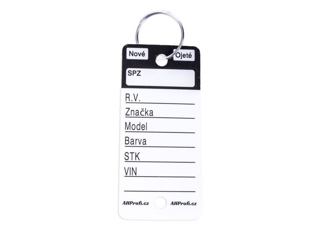 Bílé plastové visačky na klíče s černým potiskem jsou velkou pomůckou převážně pro autobazary, případně autosalony pro snadnou identifikaci klíčů. Jednoduše pak poznáte, kterému autu klíček patří díky vyplněným polím na jmenovce. Permanentním fixem, který je přiložen jako dárek, napíšete na cedulku na klíče SPZ, rok výroby, značku, model a barvu vozu. Datum STK a VIN, zaškrtnete zda se jedná o nové či ojeté vozidlo. Použitím permanentního fixu nemusíte řešit smývání, ušpiněné prsty apod. Na klíče připevníte rozlišovač za pomoci přiloženého kroužku, což může být o trochu složitější než instalace u modelů Easy-ON, nebo Econo ID.