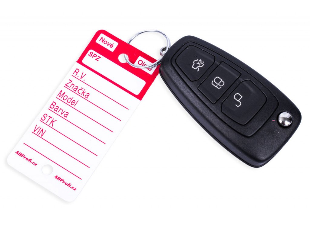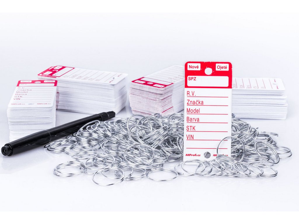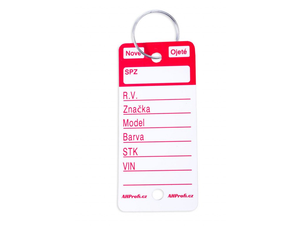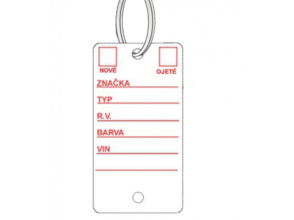 Bílé plastové visačky na klíče s červeným potiskem jsou velkou pomůckou převážně pro autobazary, případně autosalony pro snadnou identifikaci klíčů. Jednoduše pak poznáte, kterému autu klíček patří díky vyplněným polím na jmenovce. Permanentním fixem, který je přiložen jako dárek, napíšete na cedulku na klíče SPZ, rok výroby, značku, model a barvu vozu. Datum STK a VIN, zaškrtnete zda se jedná o nové či ojeté vozidlo. Použitím permanentního fixu nemusíte řešit smývání, ušpiněné prsty apod. Na klíče připevníte rozlišovač za pomoci přiloženého kroužku, což může být o trochu složitější než instalace u modelů Easy-ON, nebo Econo ID.
