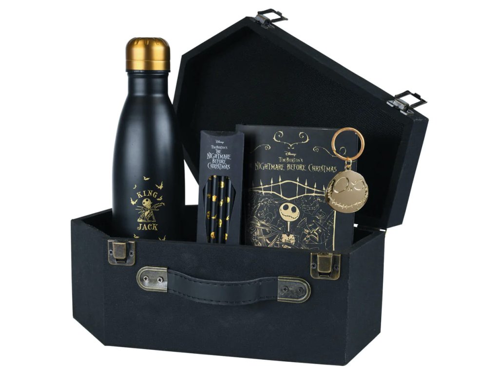 Copak se ukrývá v černé rakvi? Originální dárková sada pro fanoušky animáku filmu Nightmare Before Christmas (Ukradené Vánoce Tima Burtona) obsahuje kovovou láhev na pití s nápisem King Jack , linkovaný zápisník A6, sadu 4 tužek a kovovou klíčenku. Jedinečný dárek pro milovníky animované klasiky!Doplňkové parametry
