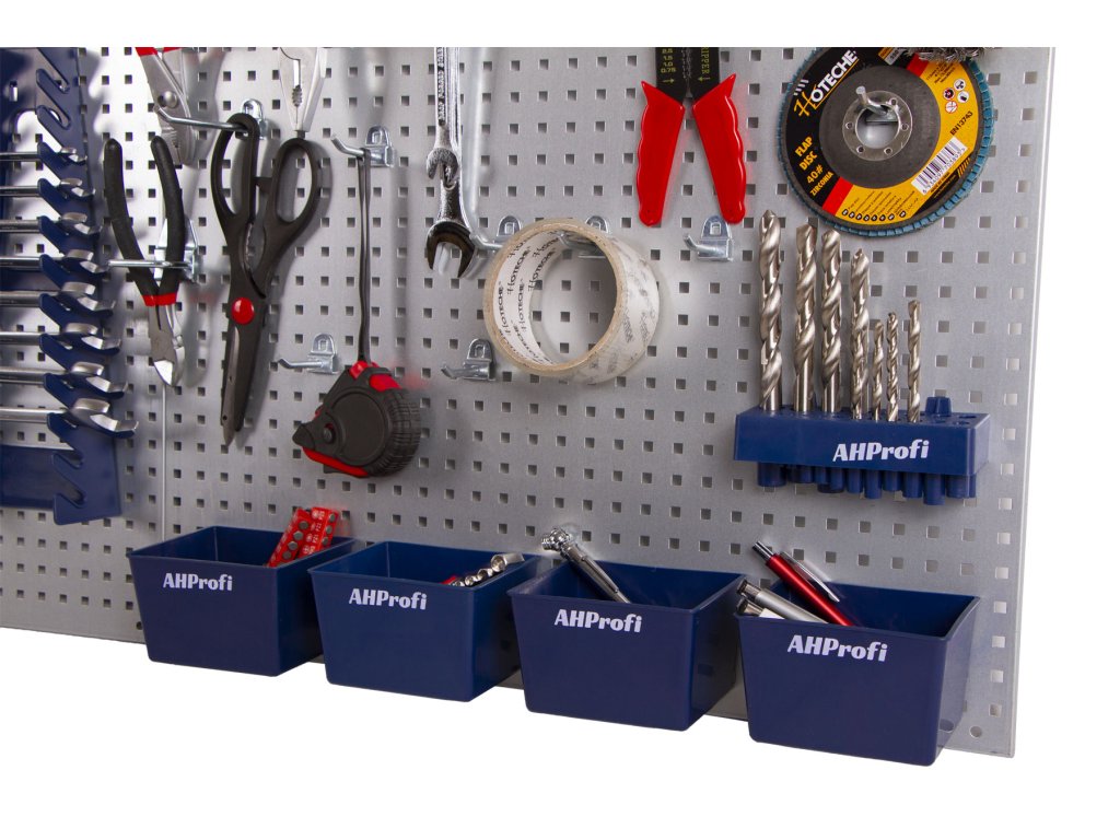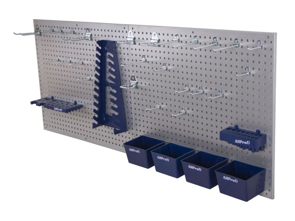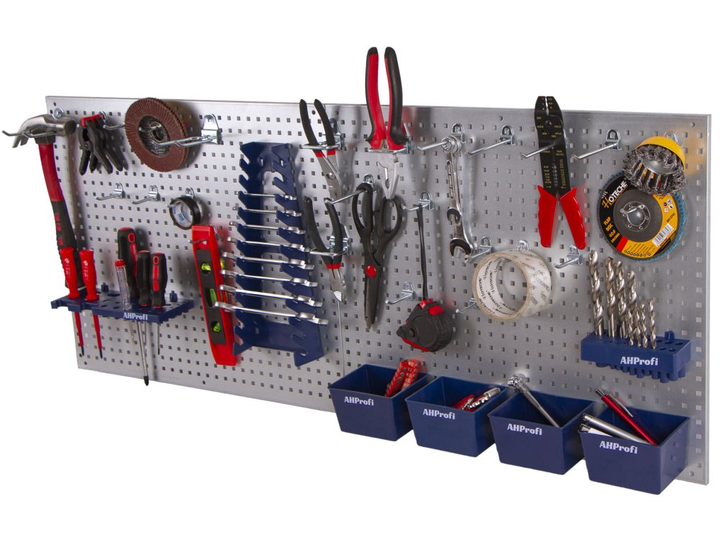 Sada kovových děrovaných desek slouží k přehlednému a praktickému uložení nářadí tak, aby bylo vždy snadno dostupné a na očích.