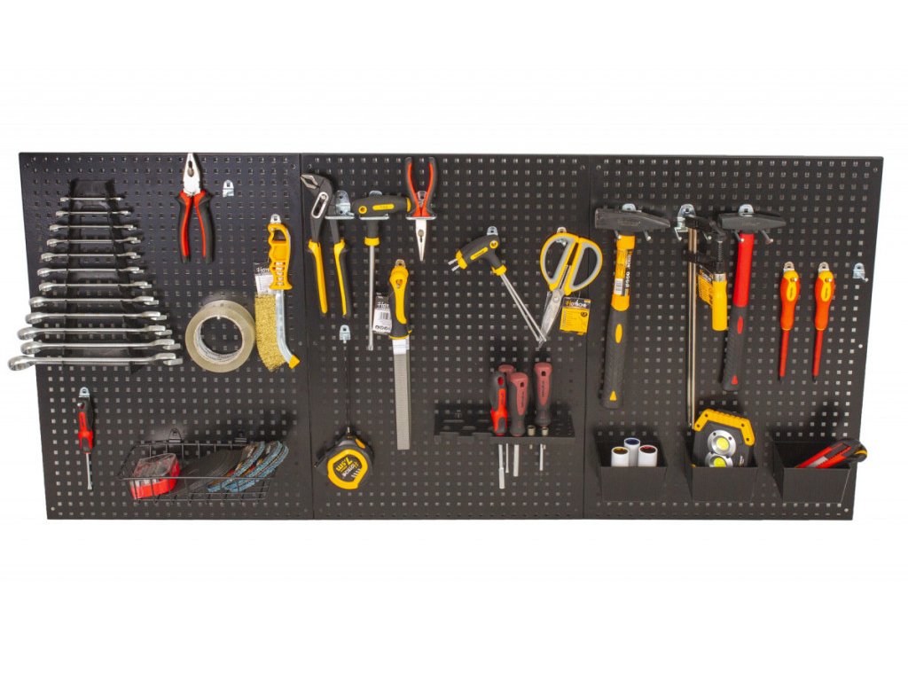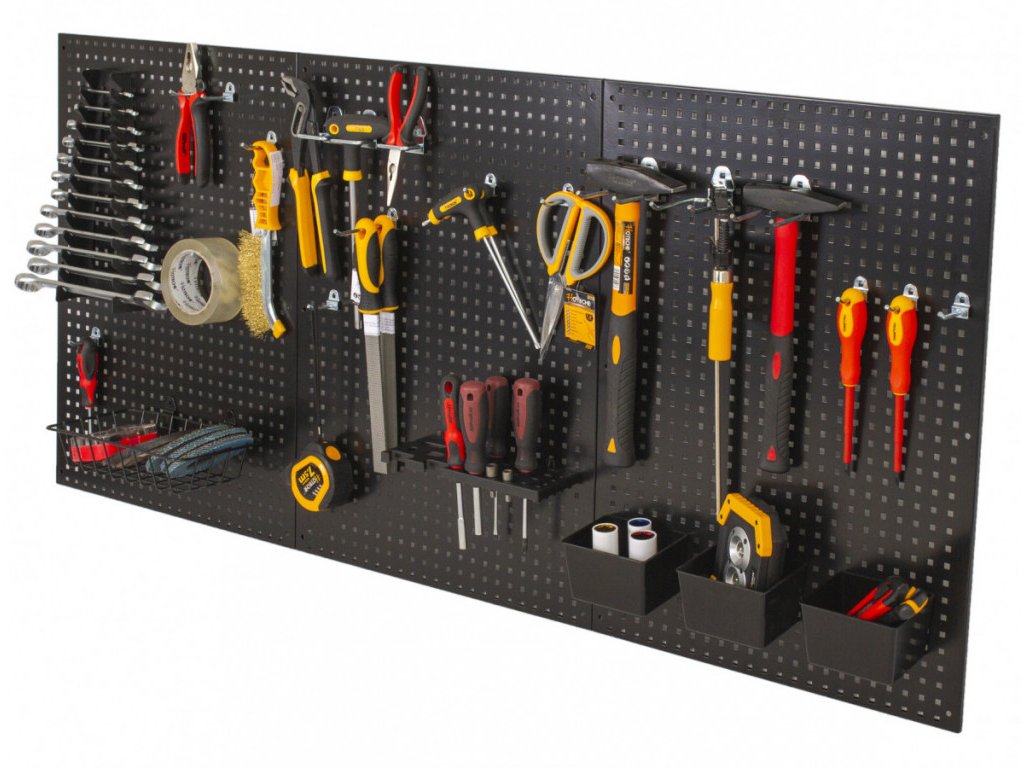 Součástí je příslušenství pro zavěšení nářadí: 1× držák klíčů, 1× závěsný košík, 1× držák šroubováků, 11× krátký háček, 1× dlouhý háček, 3× dvojitý háček, 3× držák kleští a 3× závěsná miska.
