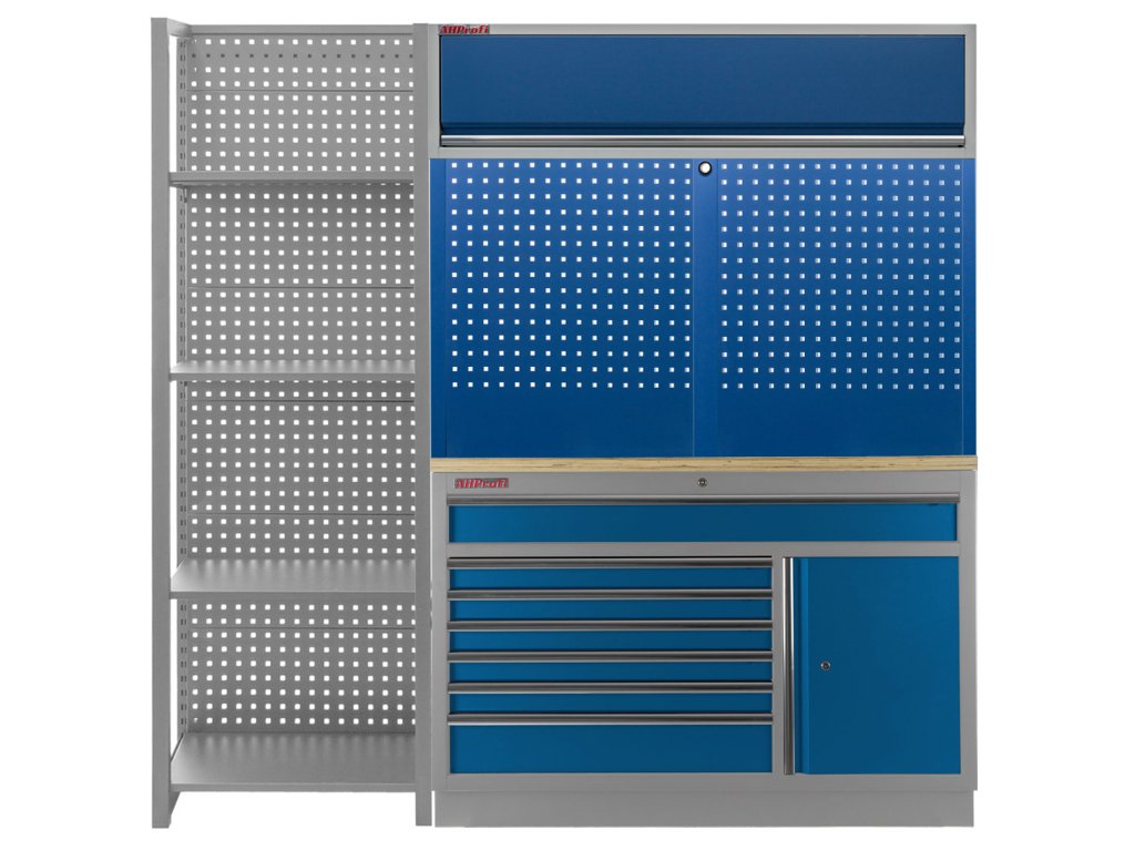 Sestava nábytku v sobě skrývá dostatečné množství úložného prostoru pro vaše nářadí, autotechniku i dílenské vybavení. V kombinaci s bytelnou pracovní deskou získáte multifunkční stěnu, se kterou vám půjde práce od ruky ve všech směrech.