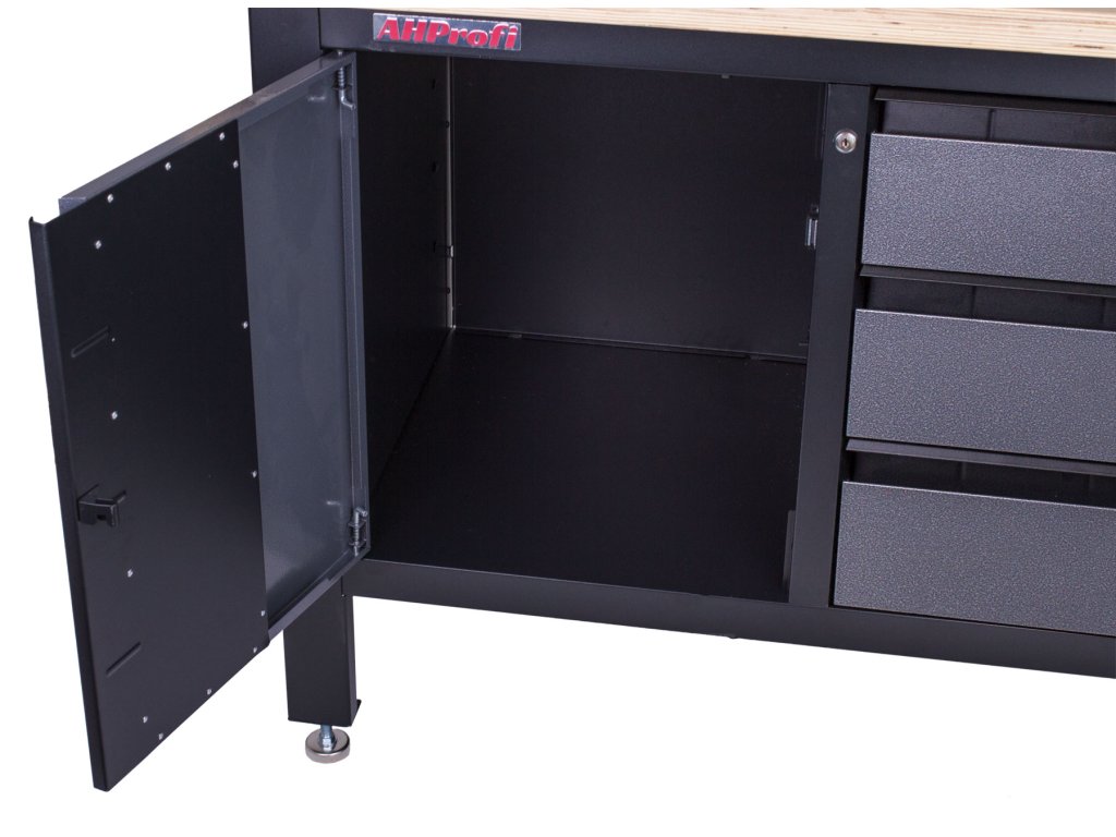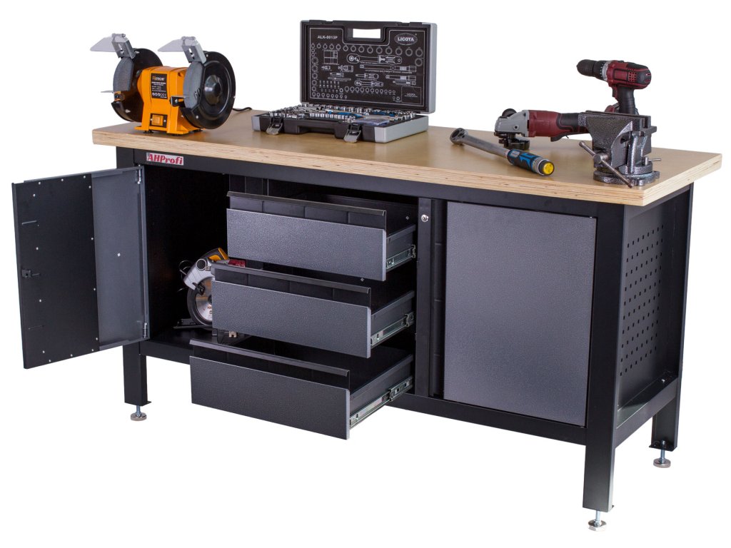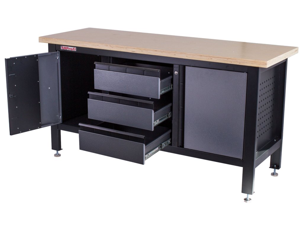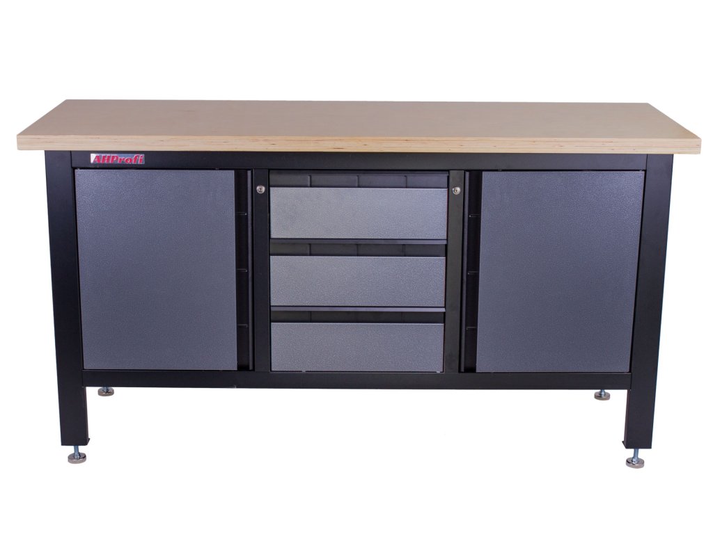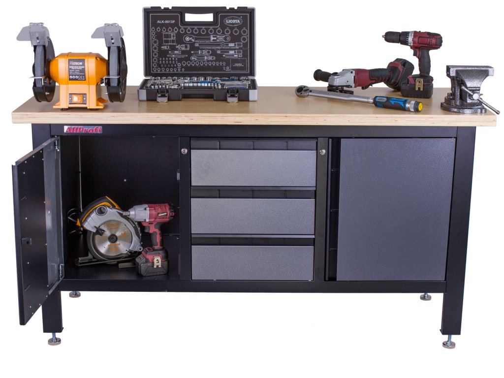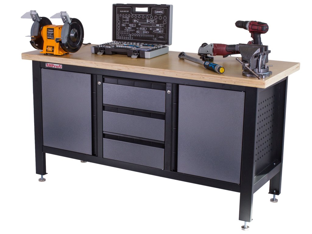 Profesionální kovový ponk vhodný pro nejnáročnější použití. Nosnost pracovního stolu je 300 kg. Je vybavený dřevěnou pracovní deskou o rozměrech 1690 x 600 mm, dvě skříňky a 3 šuplíky.