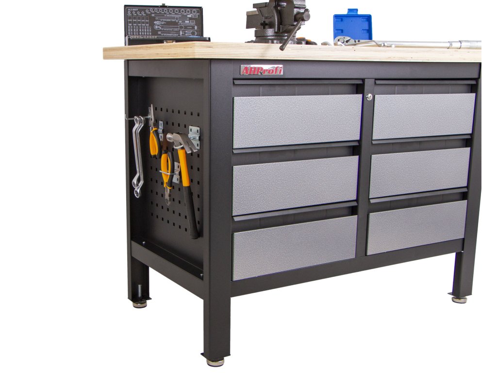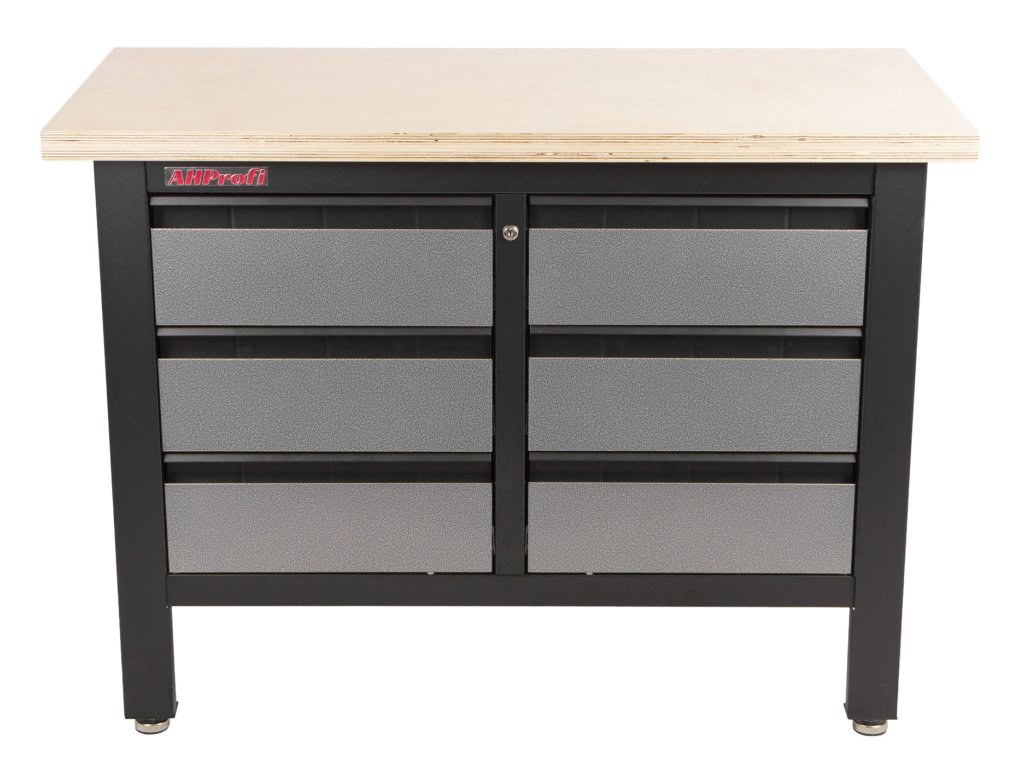 Stůl je vybavený dřevěnou pracovní deskou o rozměrech 1200 x 600 mm a obsahuje 6 uzamykatelných zásuvek.
