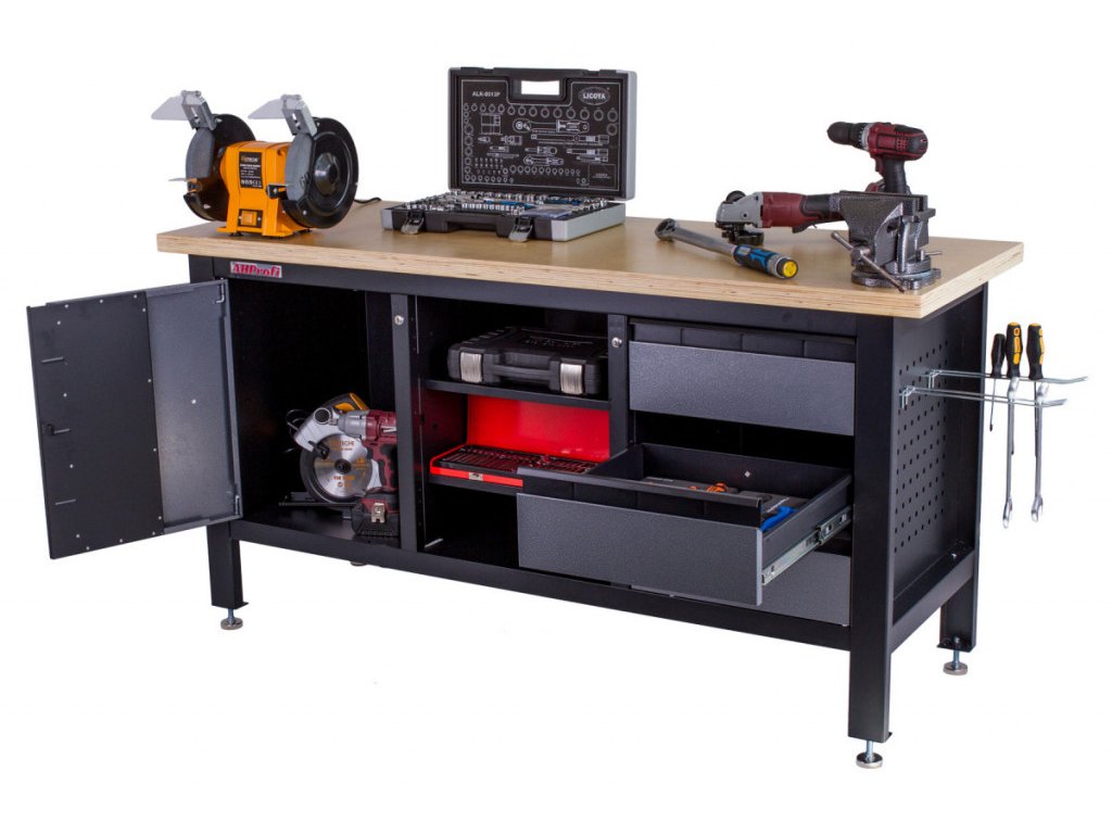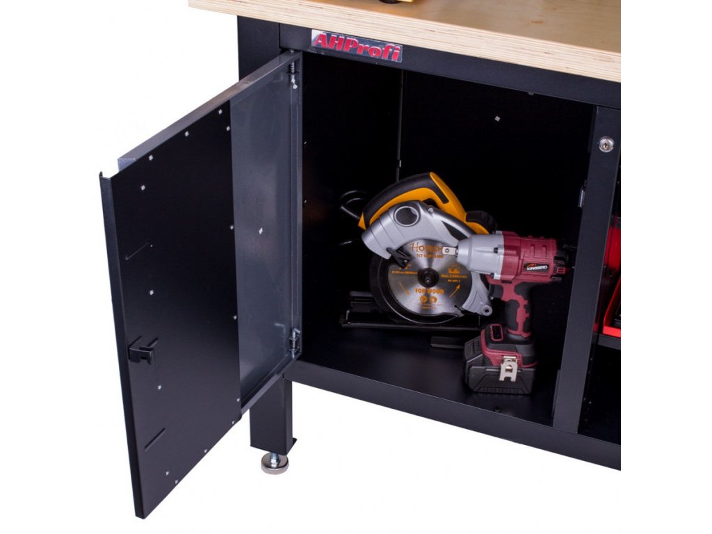 - Nosnost pracovní desky 300 kg pro těžké stroje, svěráky i velké sady nářadí.