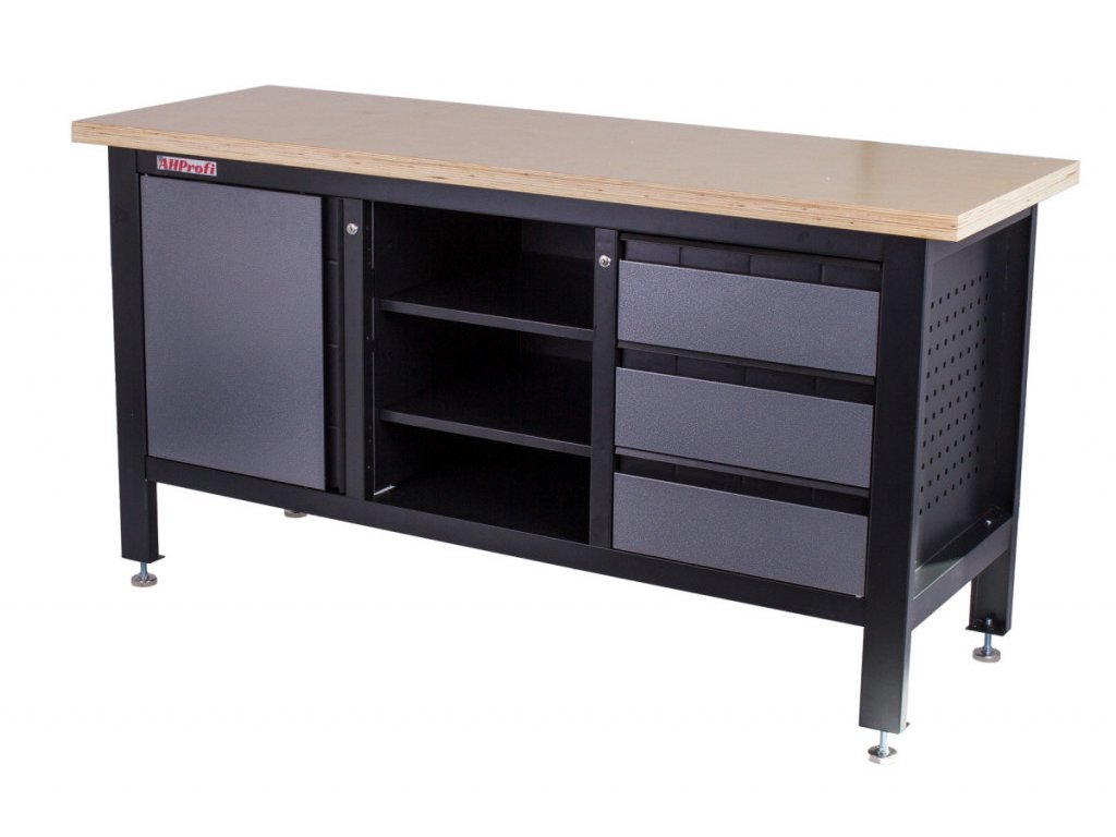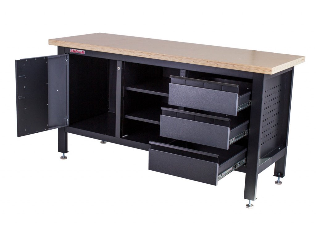 Stůl je vybavený dřevěnou pracovní deskou o rozměrech 1690 × 600 mm, uzamykatelnou skříňkou, 3 zásuvkami a 3 regály uprostřed ponku.
