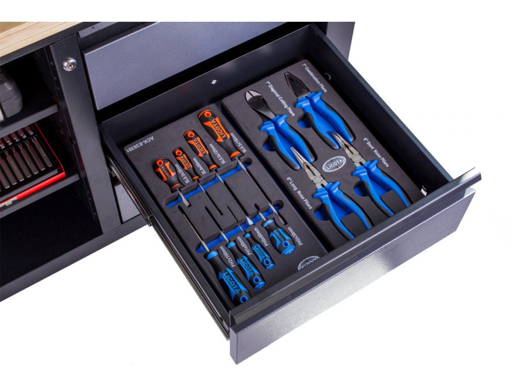 Do zásuvek lze přikoupit různé výplně s nářadím, které přesně pasují do úložného prostoru. Ideální jsou například sady kleští nebo šroubováků.