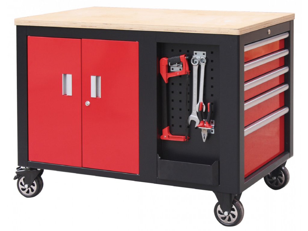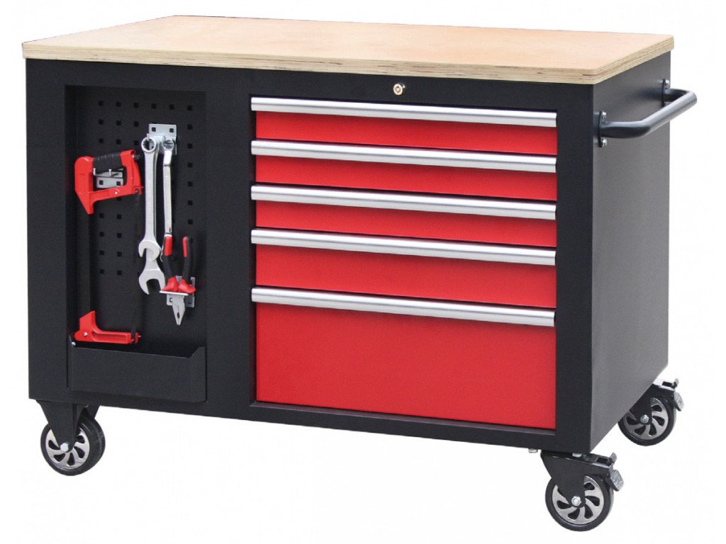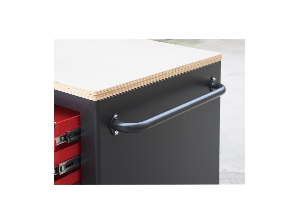 Na širších stranách vozíků jsou 2x děrované desky s přihrádkou, z jedné strany 5 zásuvek a z druhé dvoukřídlá skříňka se 2-mi poličkami. Na užších stranách se nachází dalších 5 zásuvek a madlo pro snadné manipulování s dílenských vozíkem.
