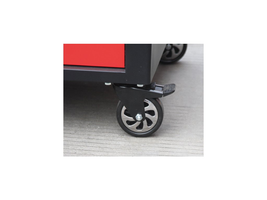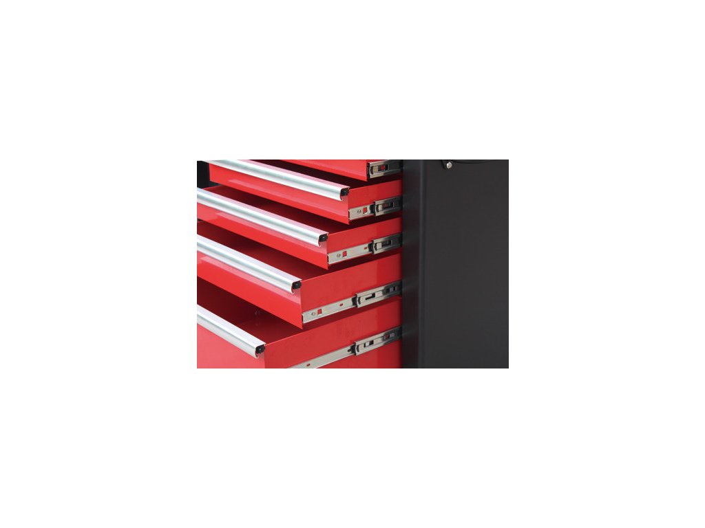 Černo-červený velký dílenský vozík s 10-ti zásuvkami o rozměrech (š x h x v): 1141 x 730 x 888 mm. Vozík je zamykatelný, má 2 pevná a 2 otočná pogumovaná kolečka a je doslova všestranný. Uskladňovací prostory má ze všech stran!