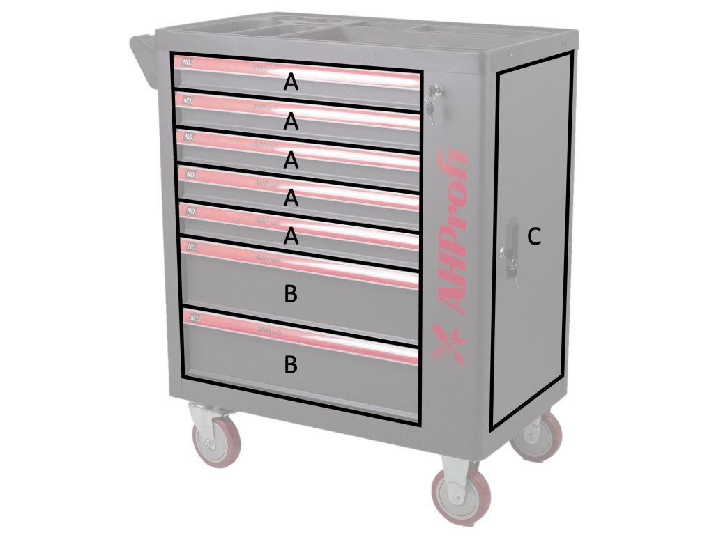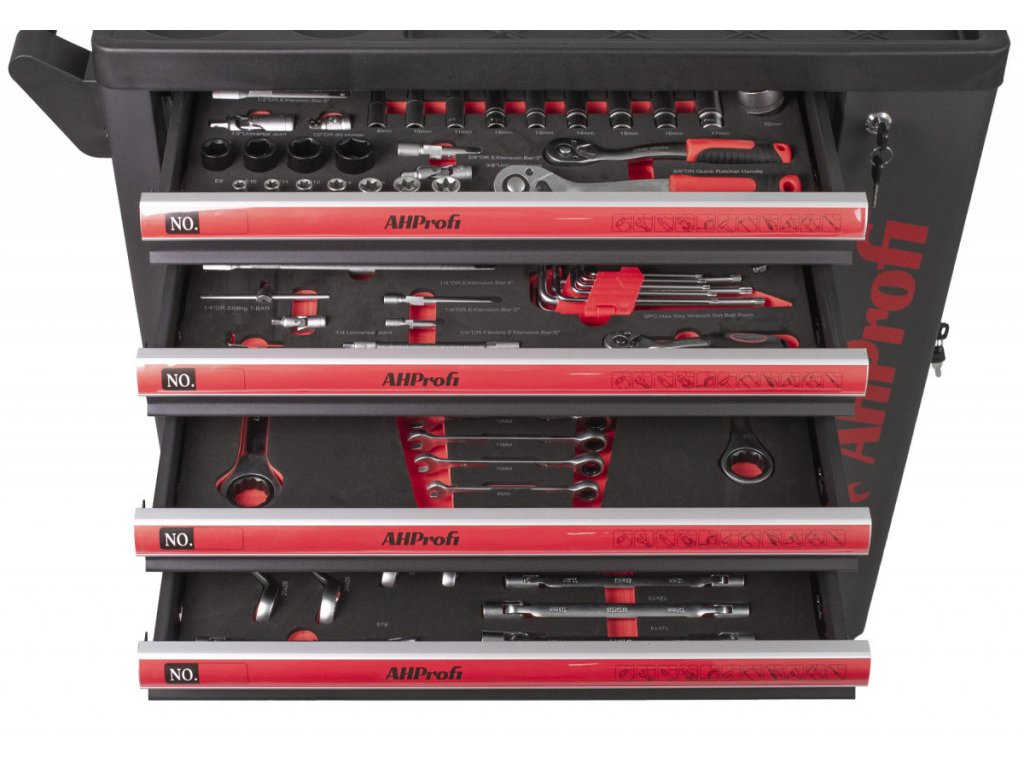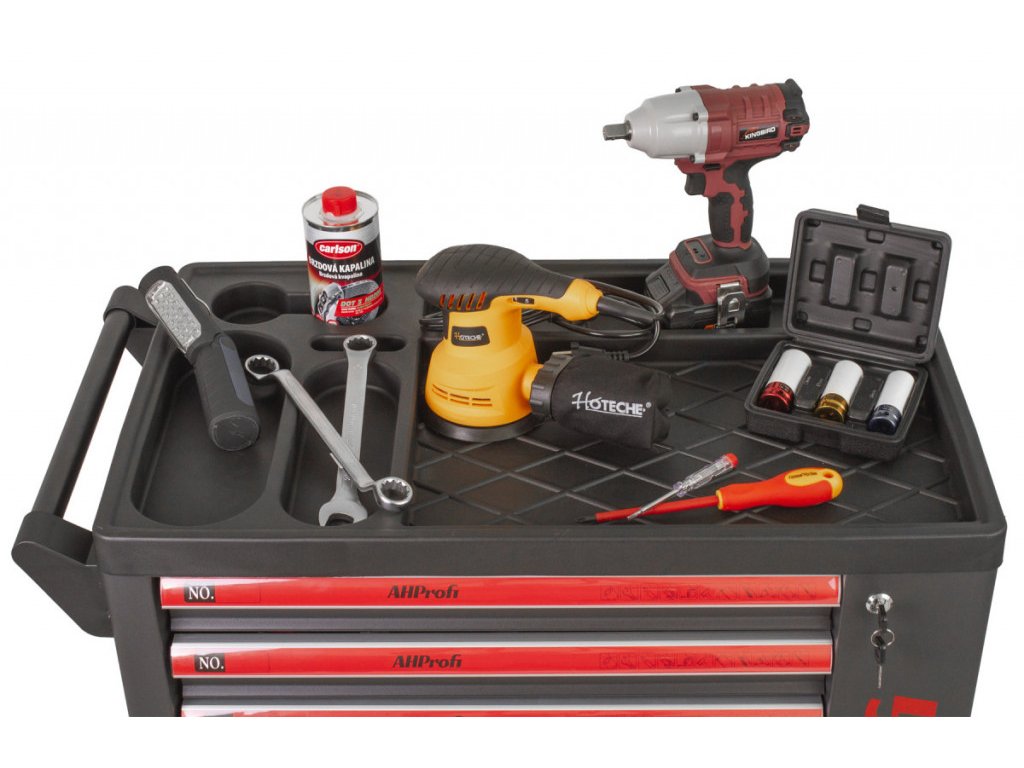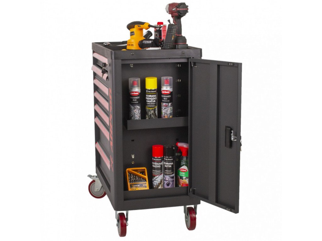 Vozík obsahuje 7 pěnových výplní s nářadím.