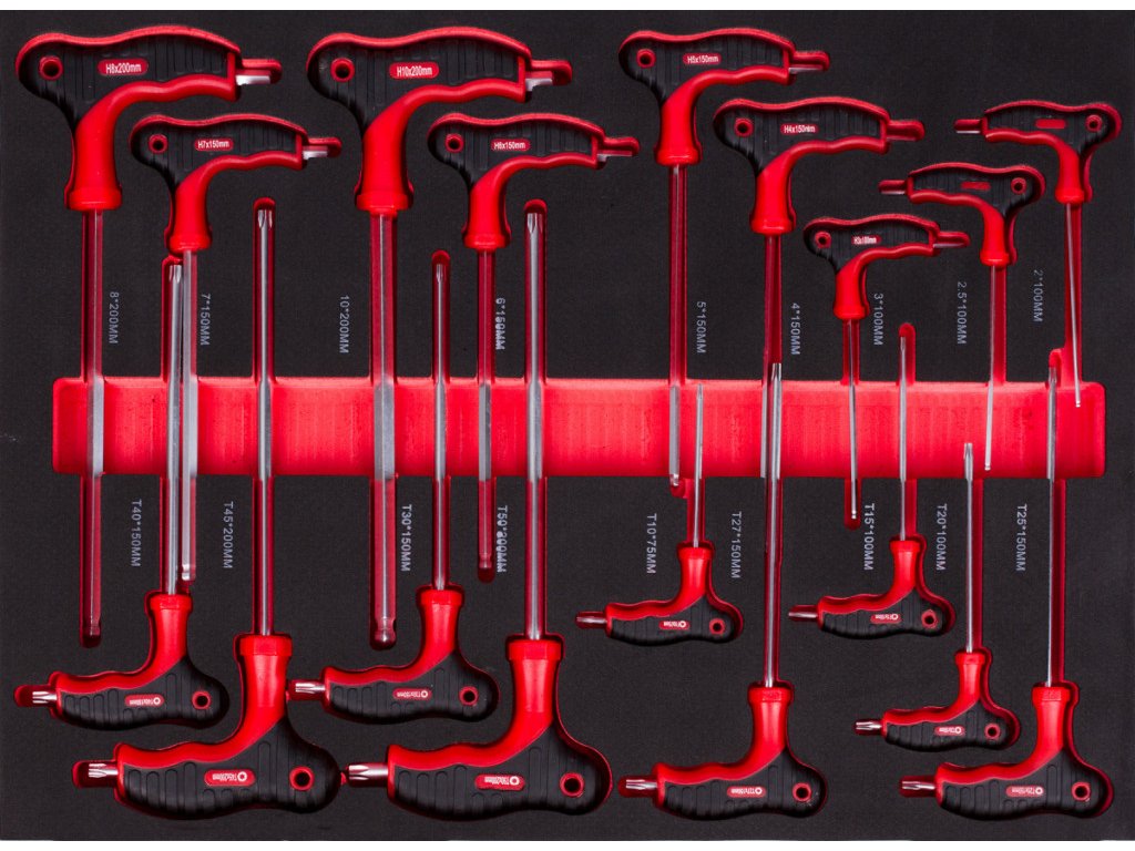 | 9 ks | Šroubováky TORX s T-rukojetí: T10 x 75, T15 x 100, T20 x 100, T25 x 150, T27 x 150, T30 x 150, T40 x 150, T45 x 200, T50 x 200 |