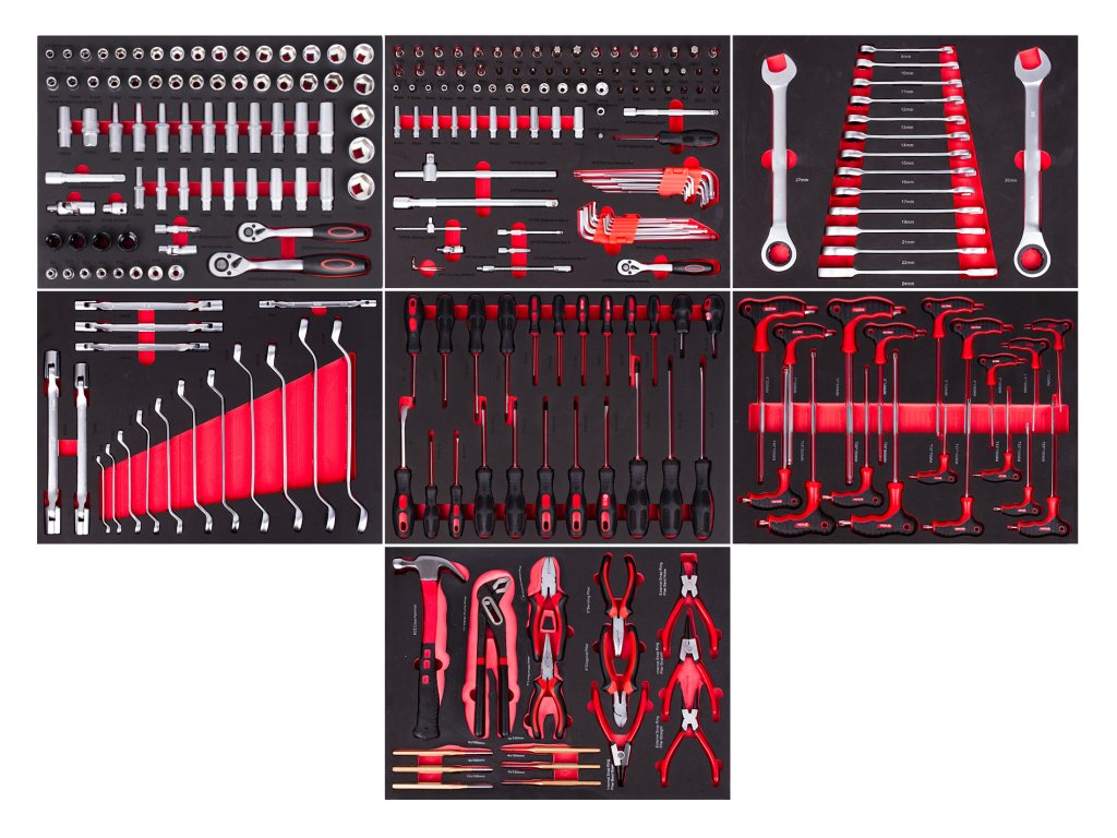 - 269 ks nářadí v 7 pěnových výplních (např. gola sady, ráčnové klíče, šroubováky, kleště)