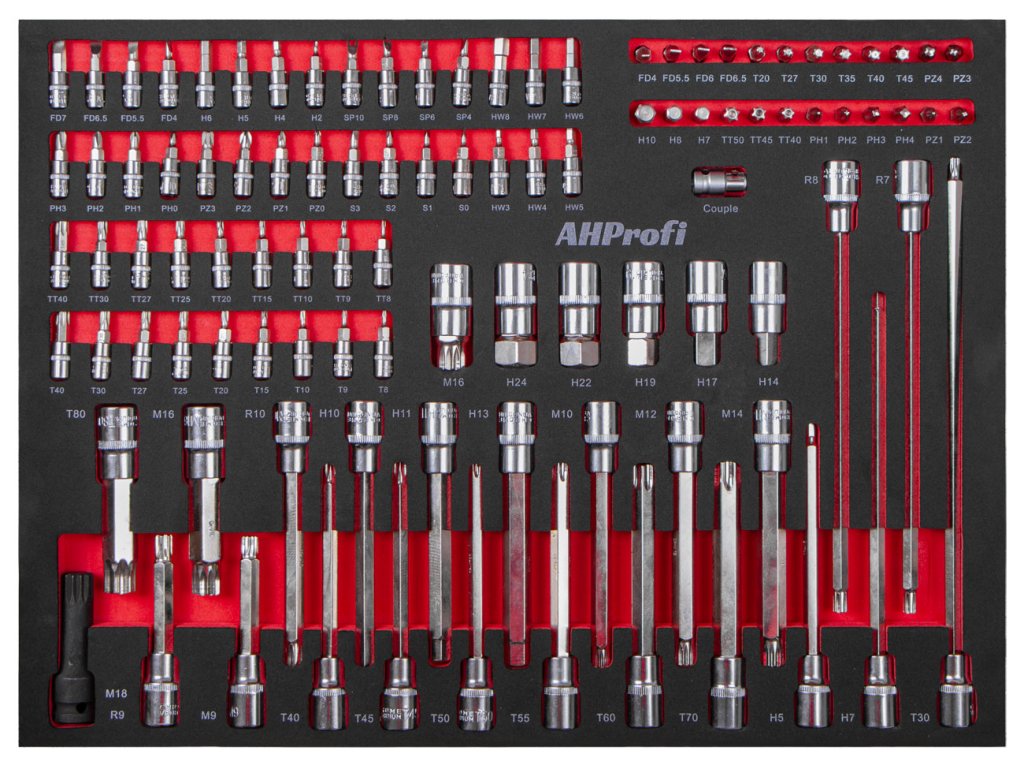 | Hlavice s bity, dlouhé (100 mm): Torx: T80 Tisícihran: M9, M16 Ribe: R9 |