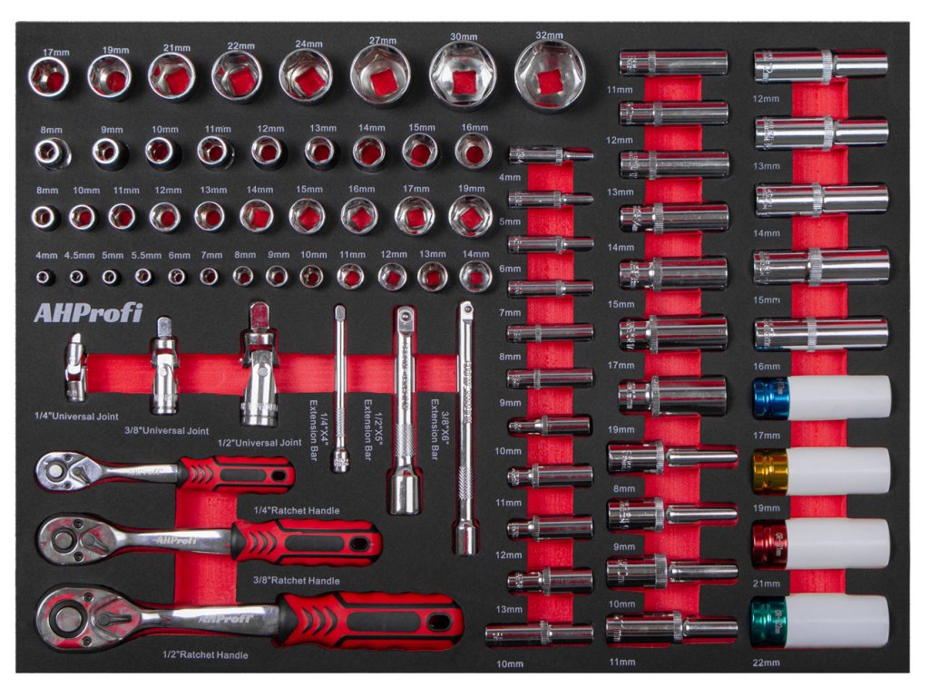 | Nástrčné klíče 1/2": Krátké: 8, 9, 10, 11, 12, 13, 14, 15, 16, 17, 19, 21, 22, 24, 27, 30, 32 mm Prodloužené: 8, 9, 10, 11, 12, 13, 14, 15, 16 mm |