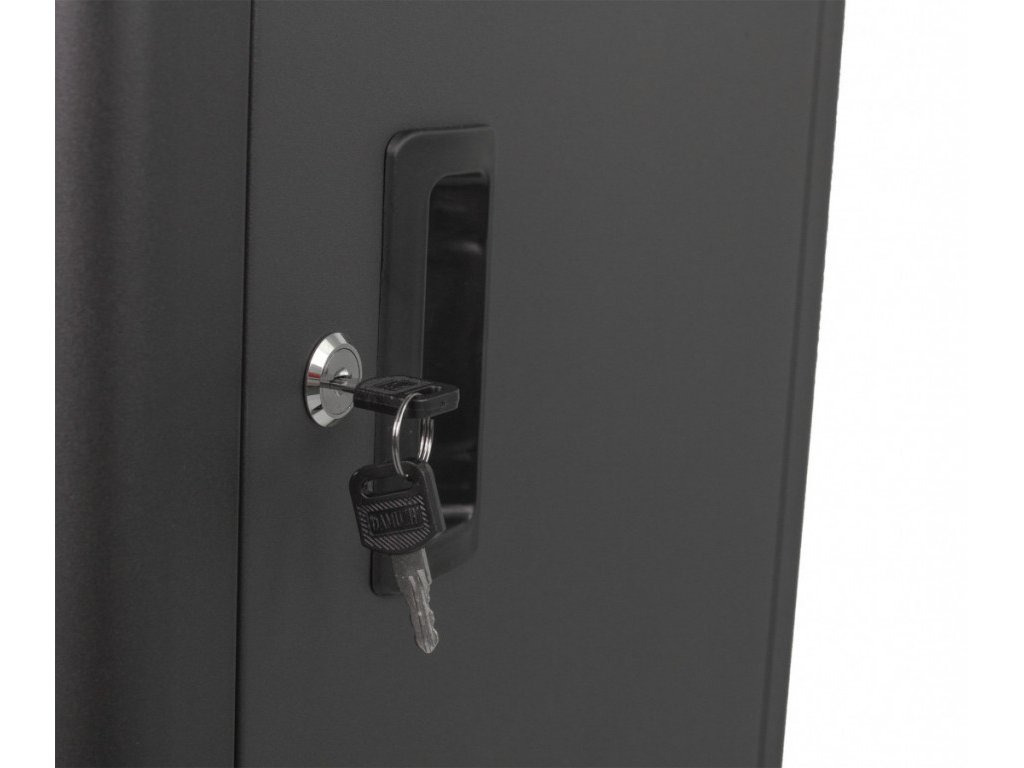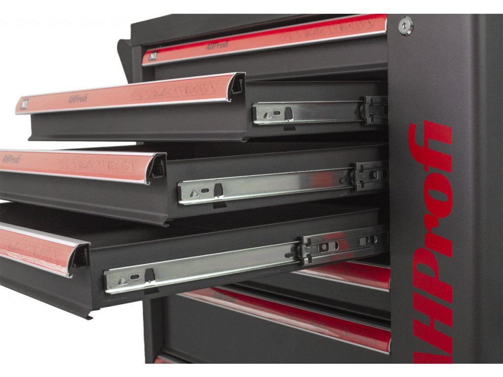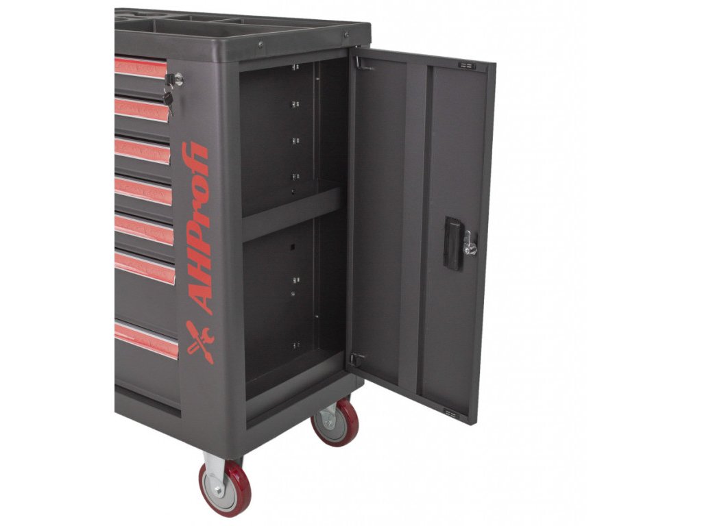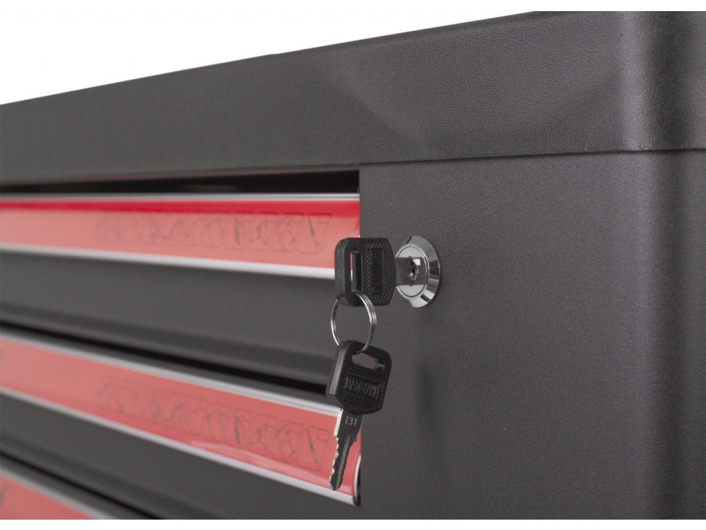 Pro zamezení přístupu nepovolaným osobám k nářadí využijete zámek na přední straně skříňky a zajistíte všech 7 zásuvek naráz. Bok skříňky je opatřený otevíratelnými dvířky s úložným prostorem.