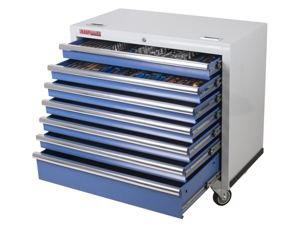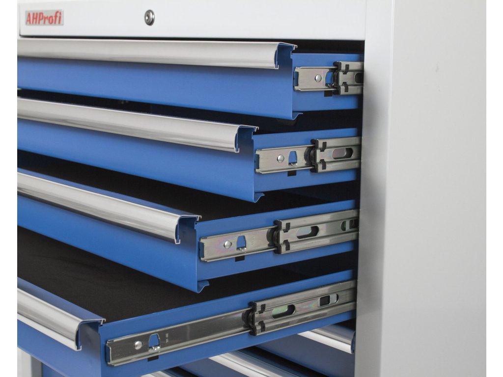 Součástí vozíku je 7 uzamykatelných zásuvek pro uložení výplní dílenského vozíku s ručním nářadím. Zásuvky jsou osazeny kuličkovými ložisky v pojezdech, čímž se zvyšuje jejich nosnost bez vlivu na výbornou vlastnost výjíždění/zajíždění.