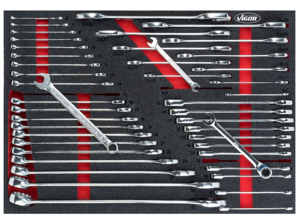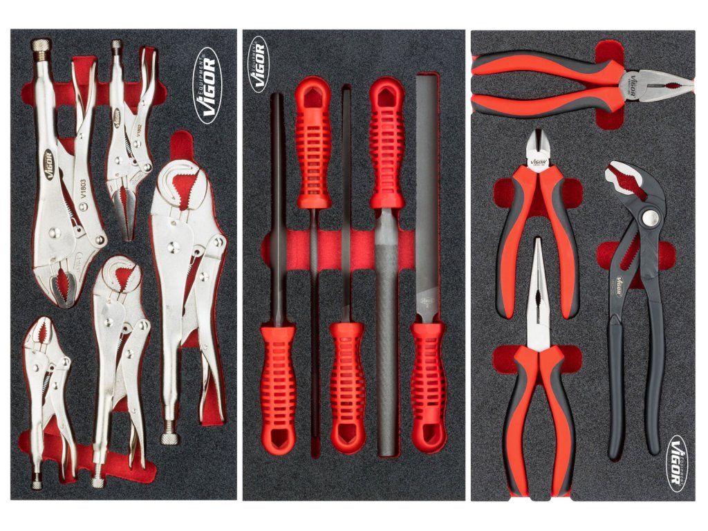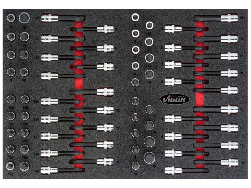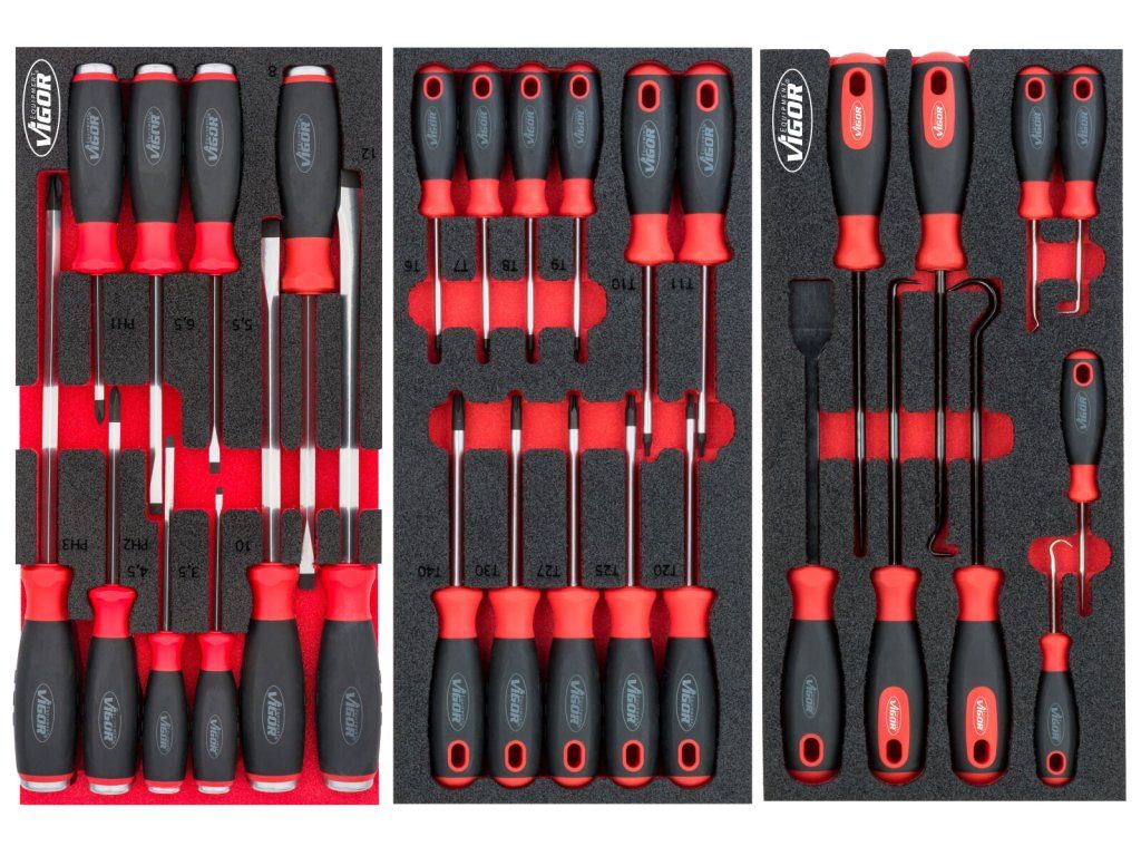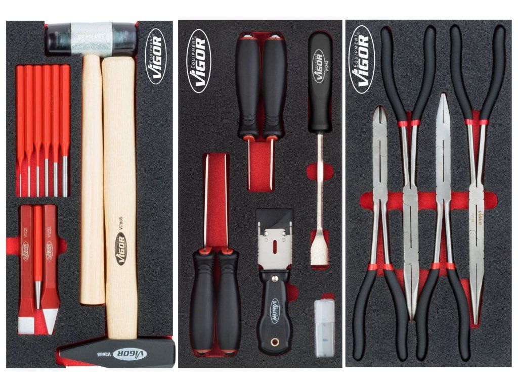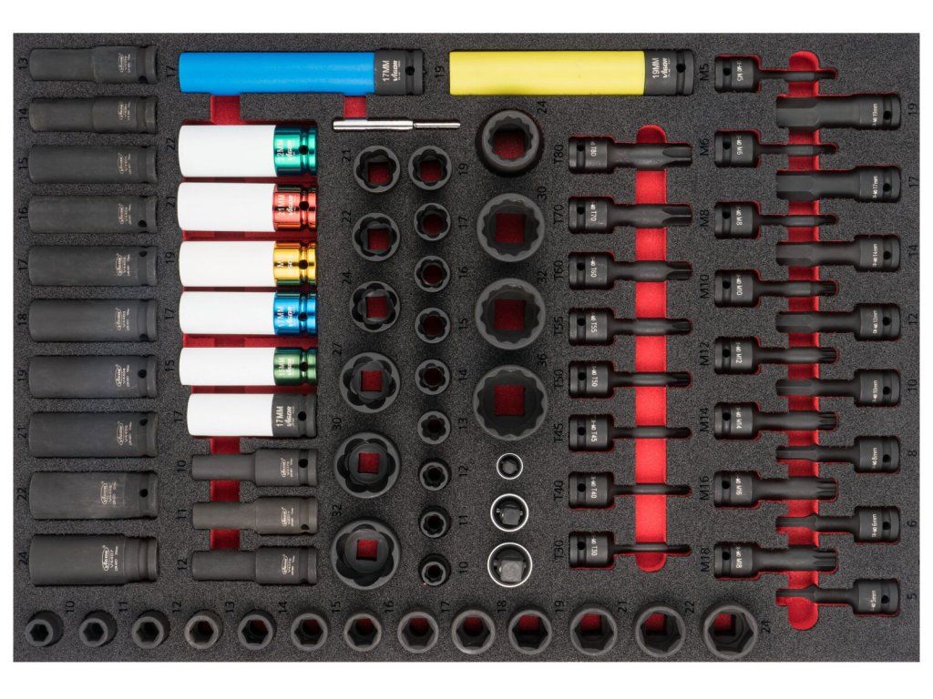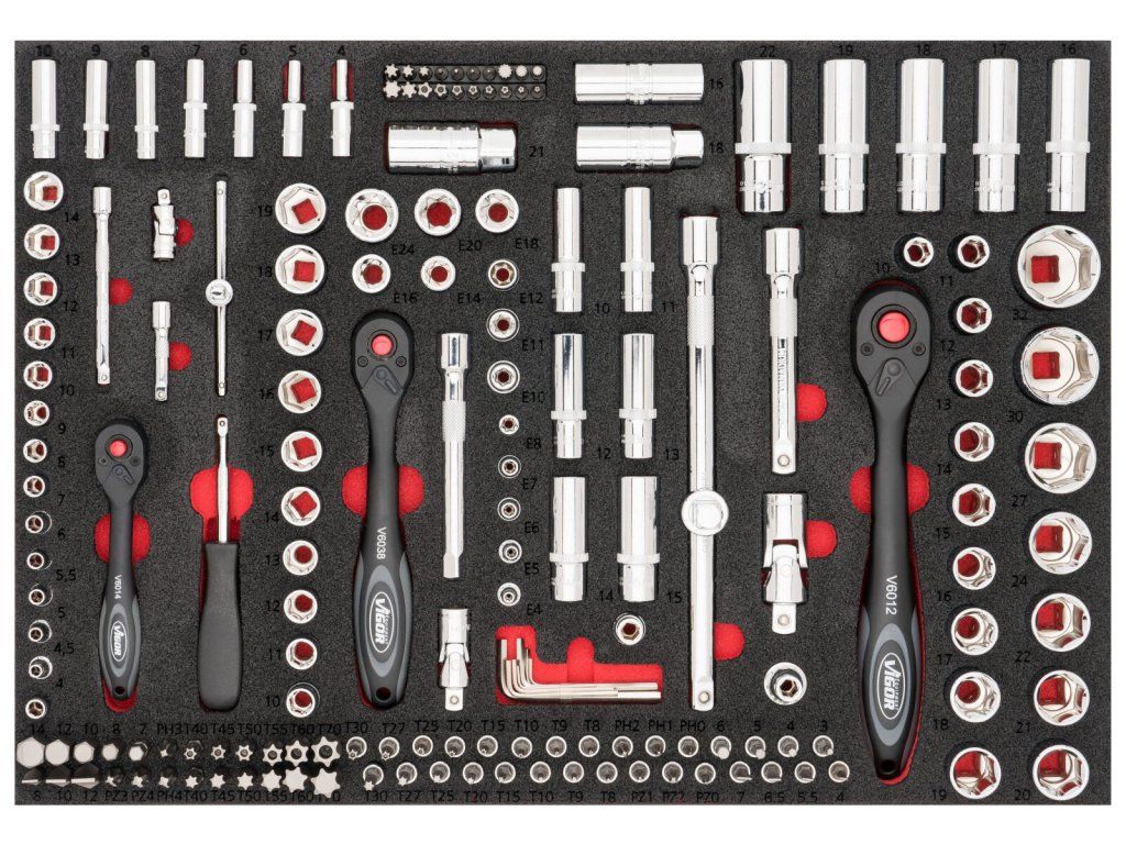 V zásuvkách jsou pěnové výplně dílenských vozíků s běžně používaným nářadím v profesionální kvalitě. V sadách nářadí naleznete golu 1/4", 1/2", 3/8", nástrčné klíče, sadu kleští, kladivo a paličku, velkou sadu šroubováků (klasické, elektrikářské i hodinářské), IMBUSY, velkou sadu klíčů a mnoho dalšího.