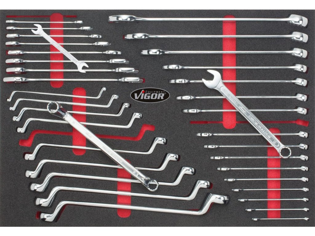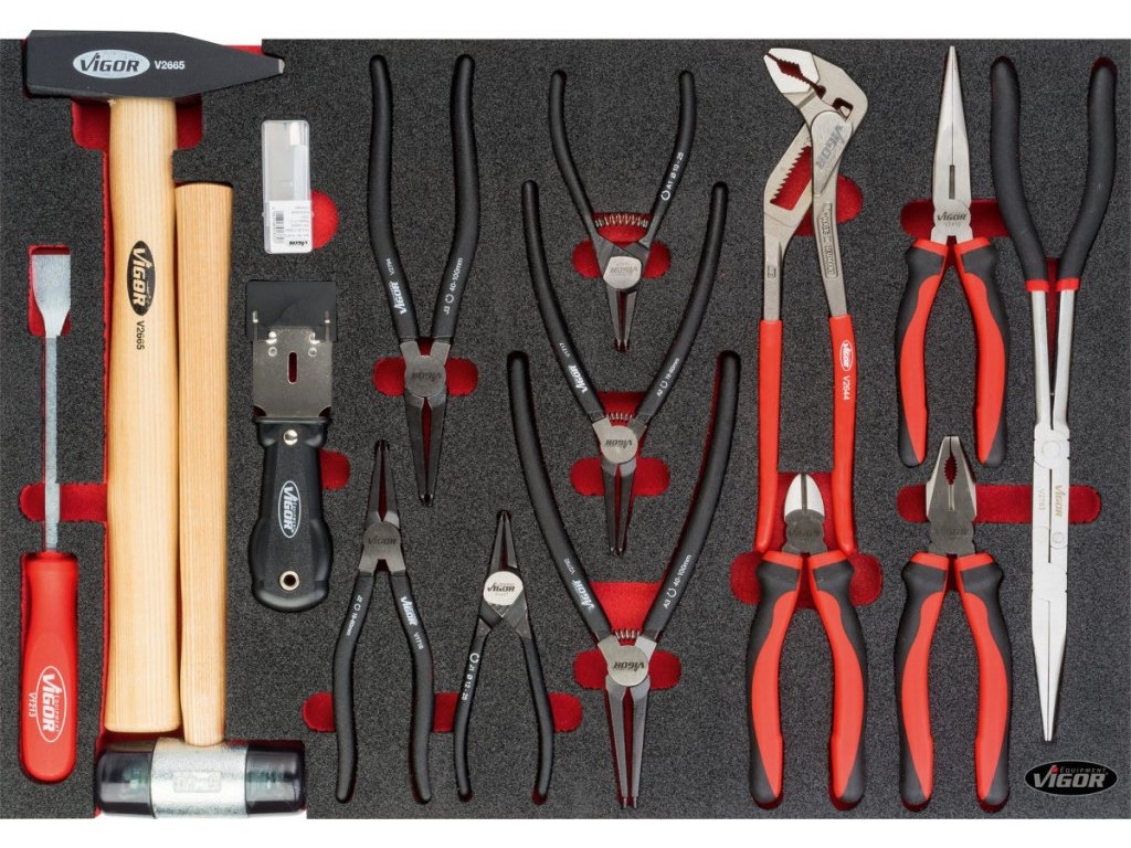 V 8 zásuvkách jsou pěnové výplně dílenských vozíků s běžně používaným nářadím v profesionální kvalitě. V sadách nářadí naleznete golu 1/4", 1/2", 3/8", nástrčné klíče, sadu kleští, kladivo a paličku, velkou sadu šroubováků (klasické, elektrikářské i hodinářské), IMBUSY, velkou sadu klíčů a mnoho dalšího.