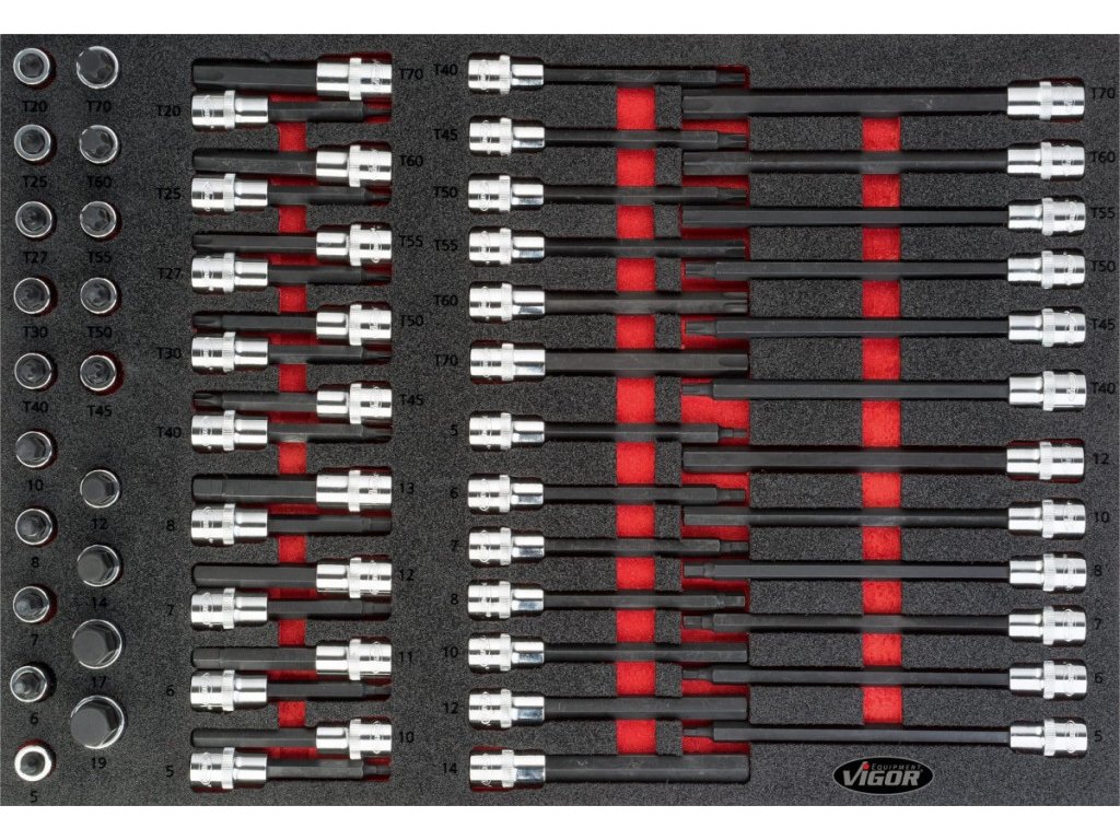 | 20 ks | Nástrčné hlavice s bity TORX 1/2": T20; T25; T27; T30; T40; T45; T50; T55; T60; T70 |