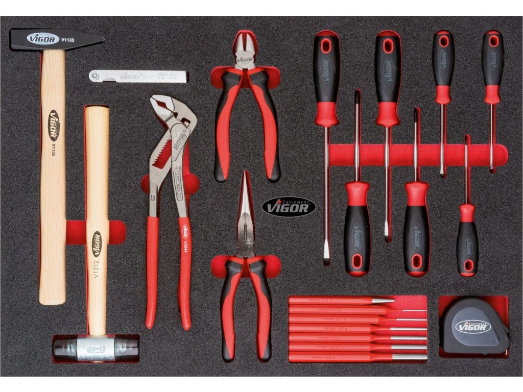 V 7 zásuvkách jsou pěnové výplně dílenských vozíků s běžně používaným nářadím v profesionální kvalitě. V sadách nářadí naleznete golu 1/4", 1/2", 3/8", nástrčné klíče, sadu kleští, kladivo, IMBUSY, velkou sadu klíčů a mnoho dalšího.