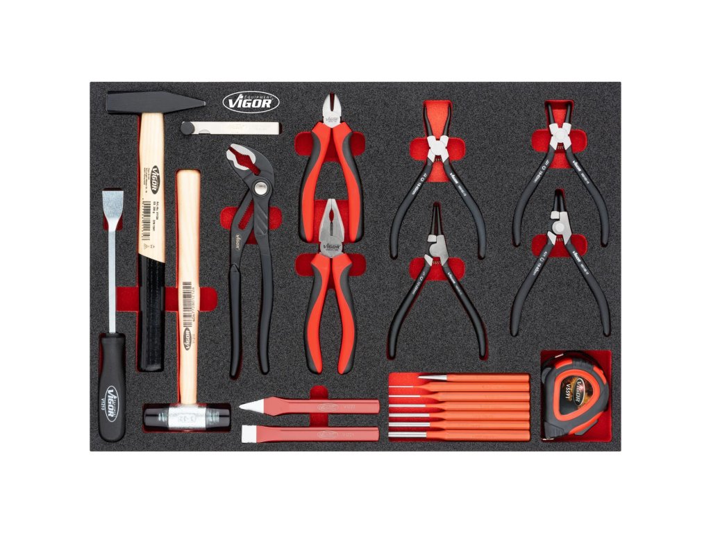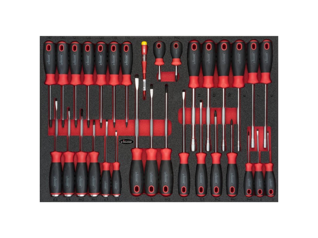 V zásuvkách jsou pěnové výplně dílenských vozíků s běžně používaným nářadím v profesionální kvalitě. V sadách nářadí naleznete golu 1/4", 1/2", 3/8", nástrčné klíče, sadu kleští, kladivo a paličku, velkou sadu šroubováků (klasické, elektrikářské i hodinářské), IMBUSY, velkou sadu klíčů a mnoho dalšího.
