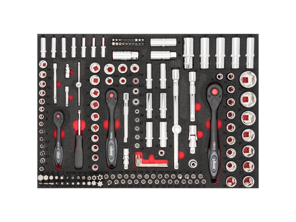 V 8 zásuvkách jsou pěnové výplně dílenských vozíků s běžně používaným nářadím v profesionální kvalitě. V sadách nářadí naleznete golu 1/4", 1/2", 3/8", nástrčné klíče, sadu kleští, kladivo a paličku, velkou sadu šroubováků (klasické, elektrikářské i hodinářské), IMBUSY, velkou sadu klíčů a mnoho dalšího.