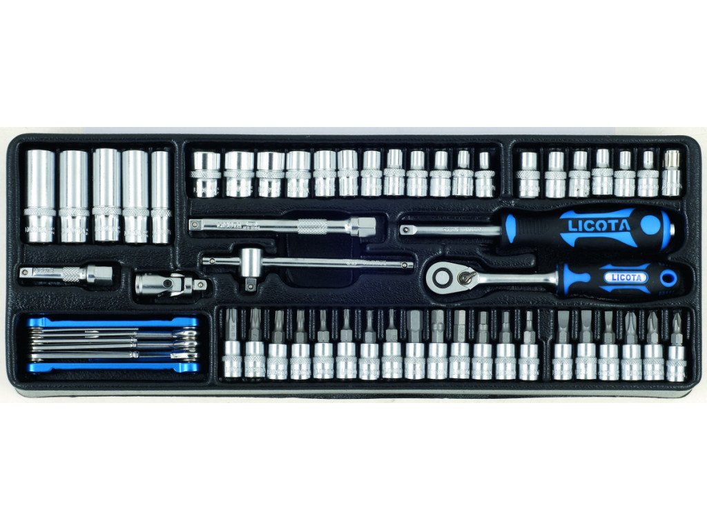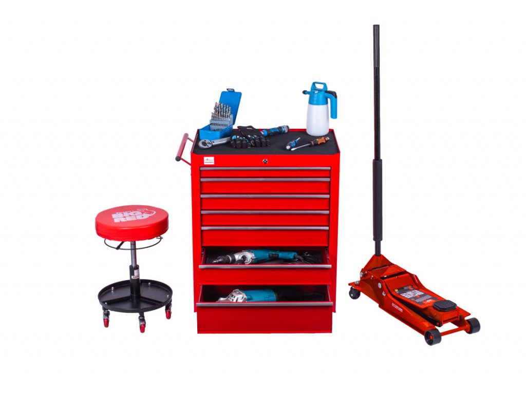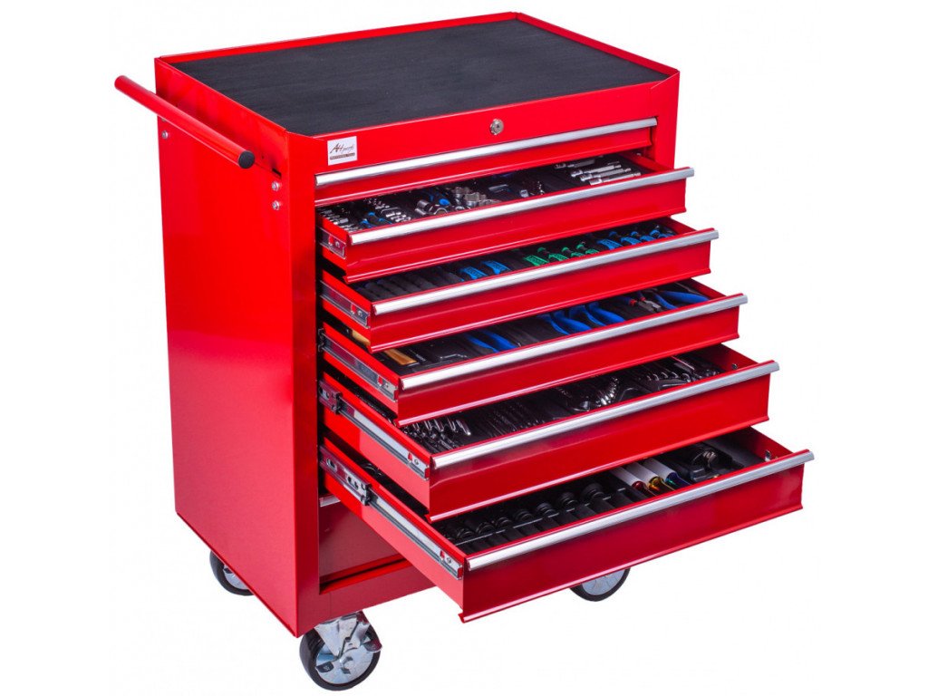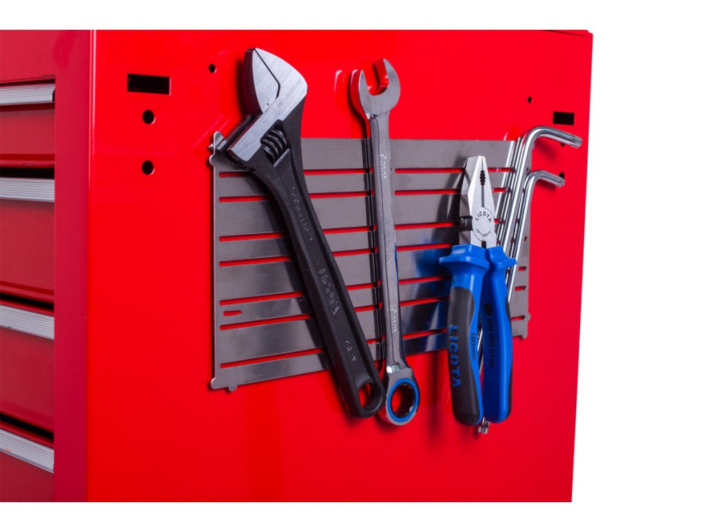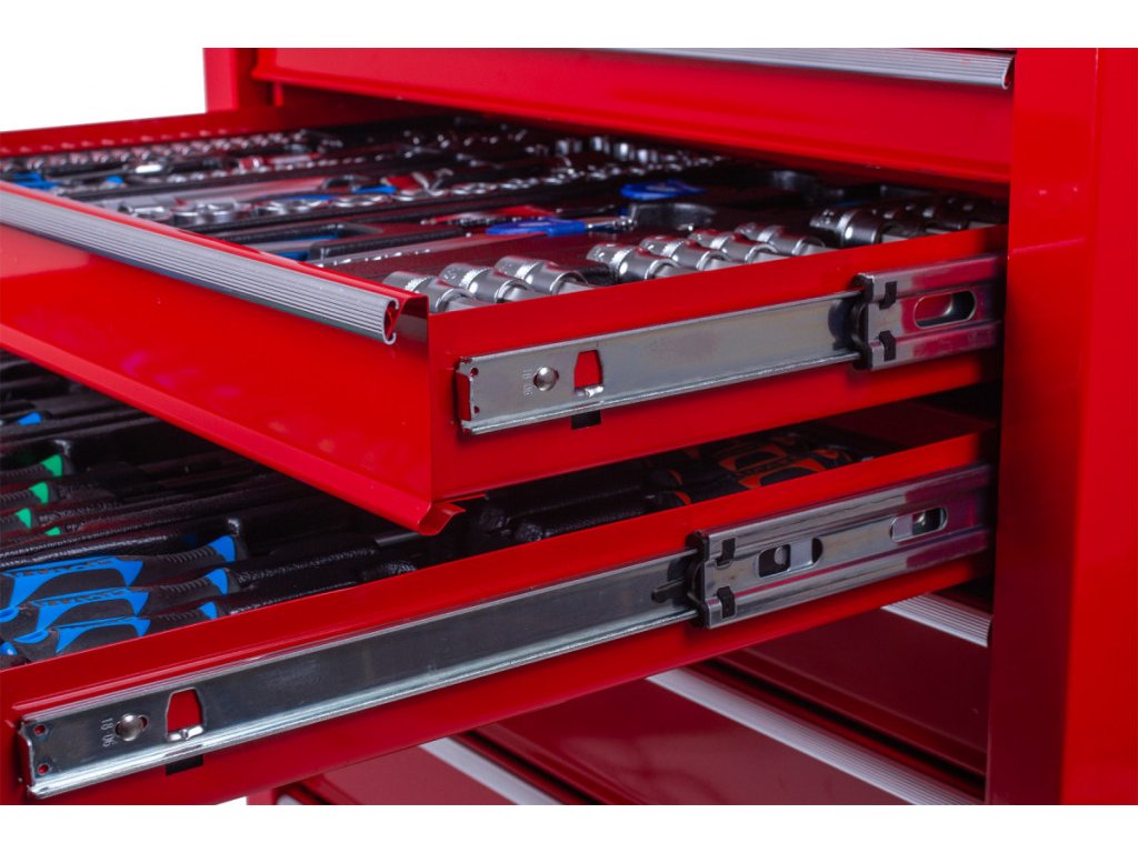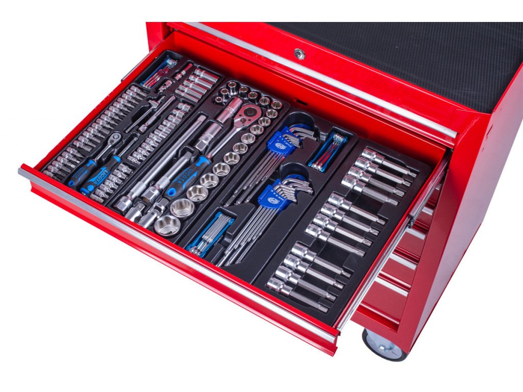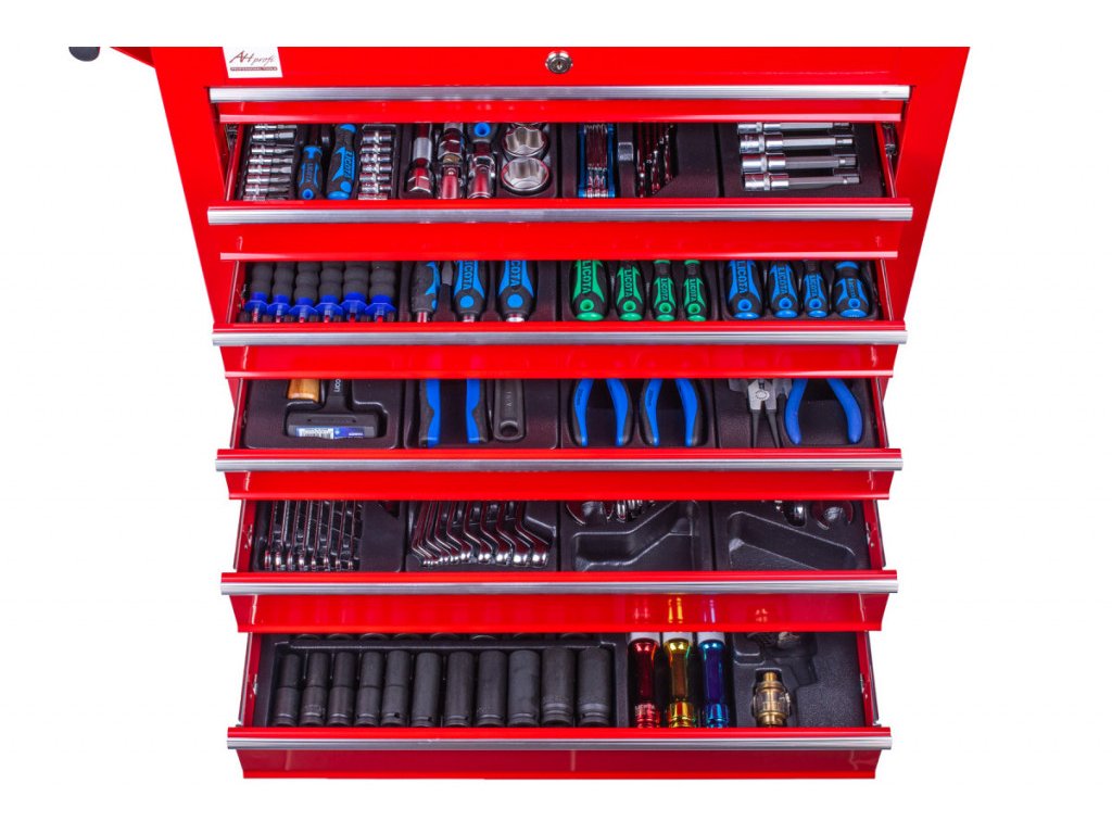 Červený dílenský vozík se 7-mi zásuvkami obsahuje 255 kusů nejpotřebnějšího nářadí od PROFI značky LICOTA. Rozměry vozíku s kolečky jsou: 755 x 460 x 955 (š x h x v). Nářadí se nachází v 17-ti plastových výplní. V sadách nářadí naleznete golu 1/4", 3/8" i 1/2", nástrčné klíče, kleště, kladivo a paličku, šroubováky, IMBUSy, očkoploché klíče, momentový klíč, pneumatický utahovák, atd.
