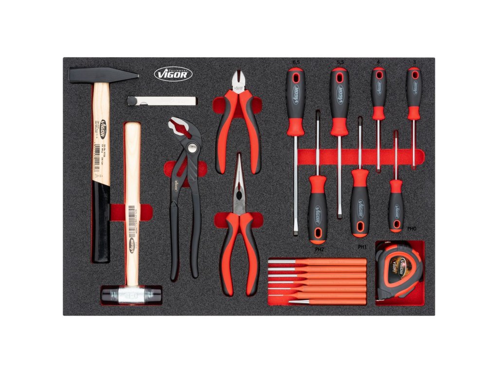 V zásuvkách jsou pěnové výplně dílenských vozíků s běžně používaným nářadím v profesionální kvalitě. V sadách nářadí naleznete golu 1/4", 1/2", 3/8", nástrčné klíče, sadu kleští, kladivo a paličku, sadu šroubováků, velkou sadu klíčů a mnoho dalšího.
