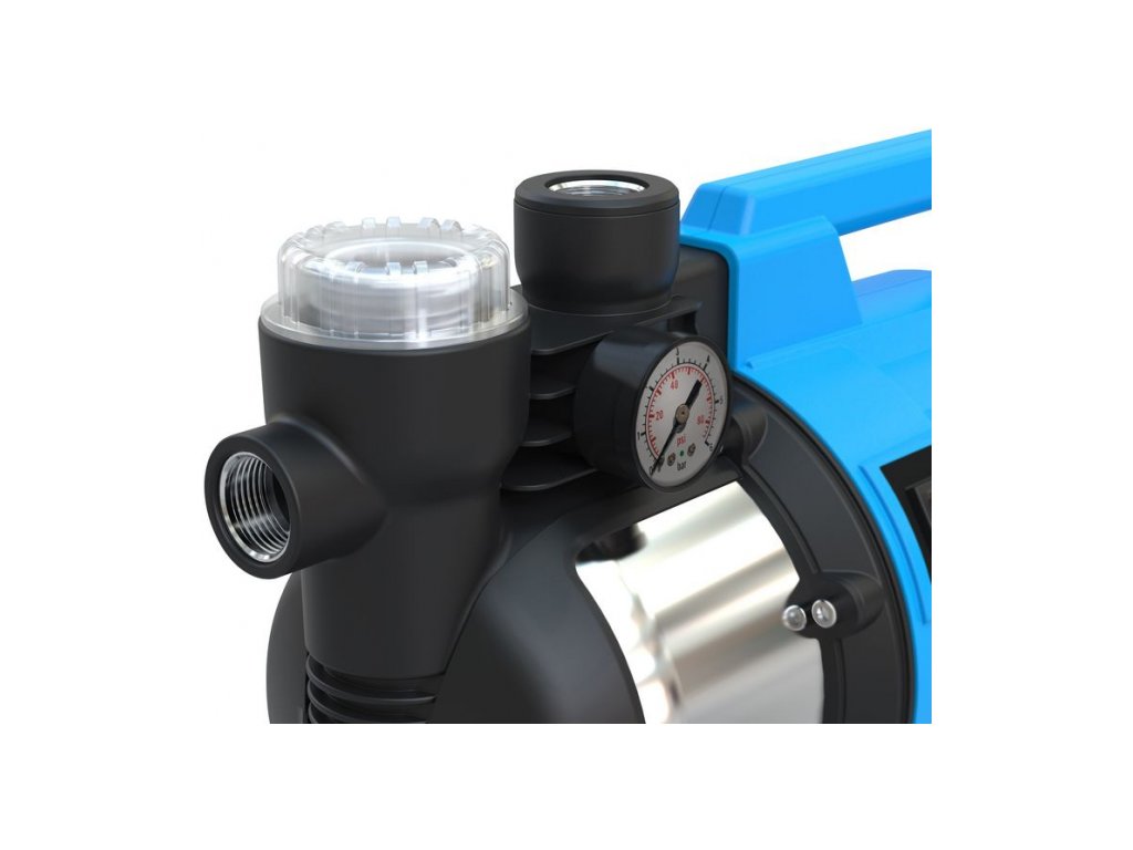 Konstrukce: korpus čerpadla z ušlechtilé oceli a odolného plastu, přípojky sacího i výtlačného vedení s kovovými závity, keramická ucpávka, manometr. Gumové stojné patky pro vysokou stabilitu během provozu, ergonomicky tvarovaná transportní rukojeť.