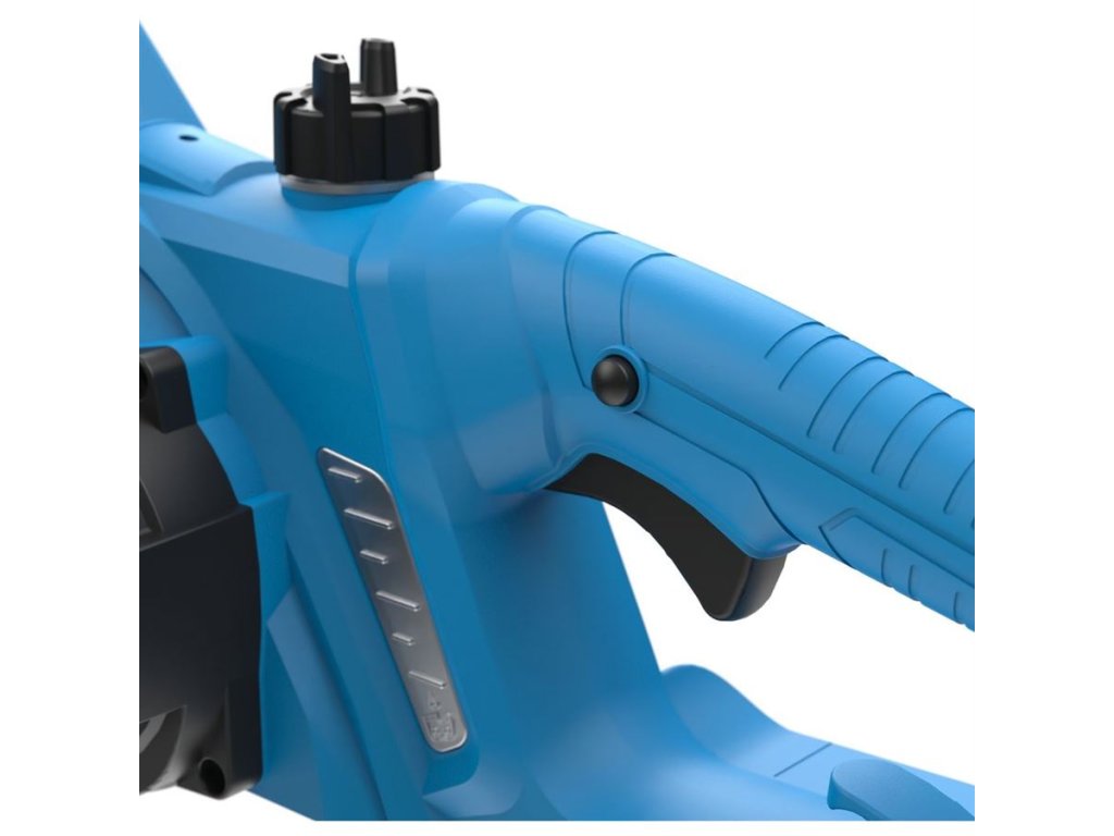 Konstrukce: plášť pily z tvrzeného plastu, ergonomicky tvarovaná rukojeť, olejová nádrž s průhledovými okénky, zubová opěrka.