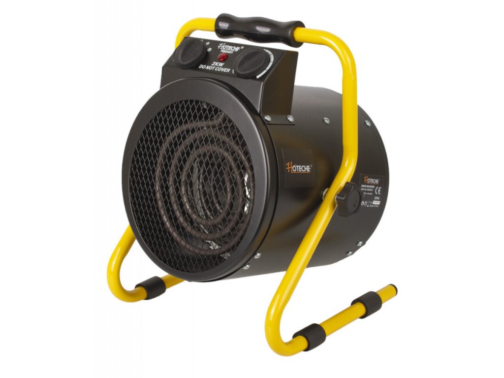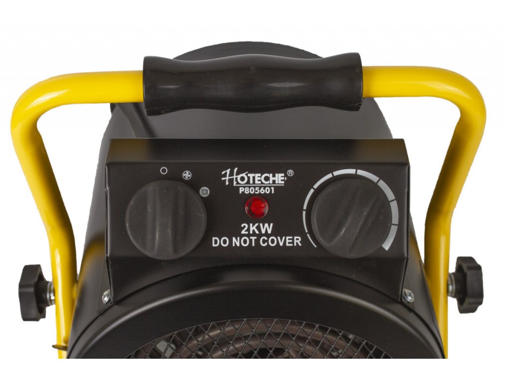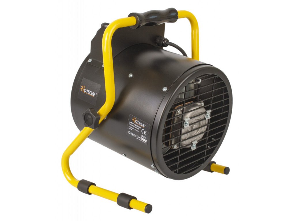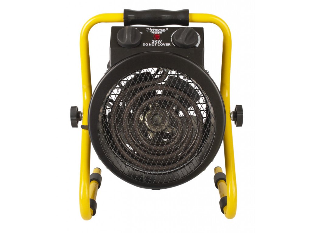 Robustní elektrický přímotop s ventilátorem. Přímotop je díky své nízké hmotnosti a madlu lehce přemístitelný.