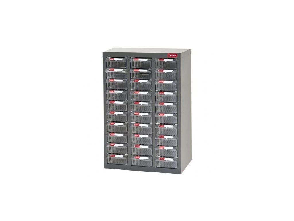 - Galvanizovaný kovový organizér pro uložení montážního materiálu a nářadí s 30 zásuvkami.