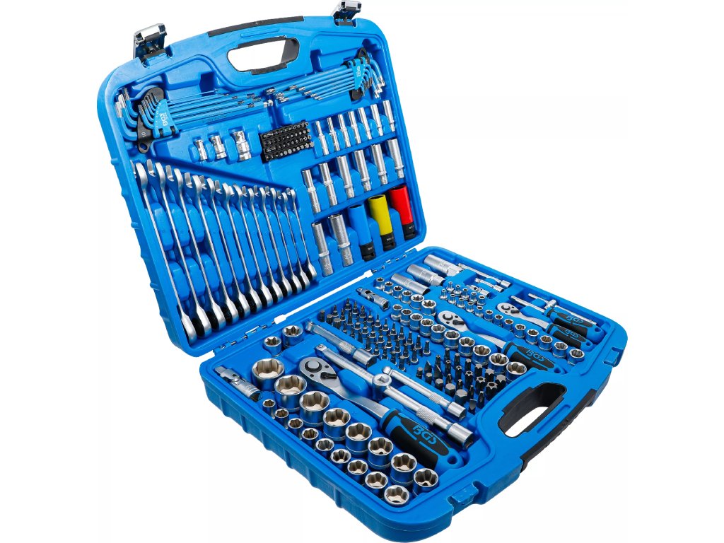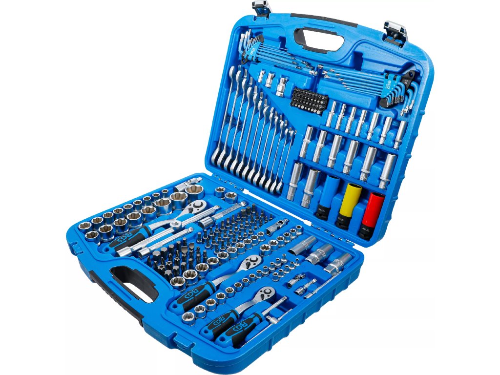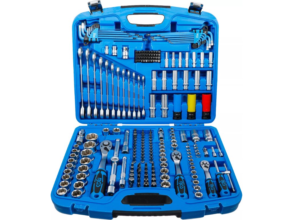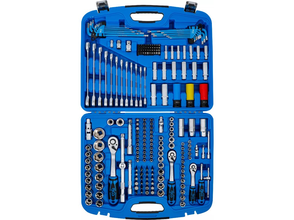 Kvalitní gola sada 1/2", 3/8", 1/4" obsahuje ráčny 72 zubů, nástrčné klíče s profilem Super Lock, bity, ráčnové klíče a další příslušenství pro práce v dílně, servisu i domácnosti.