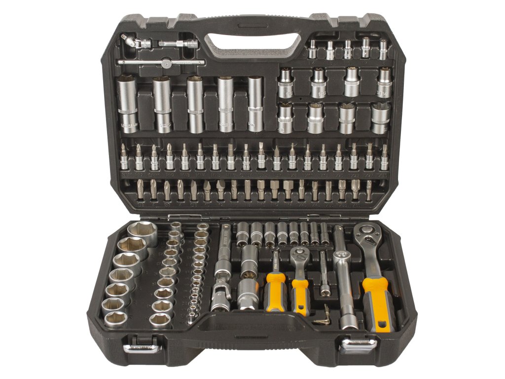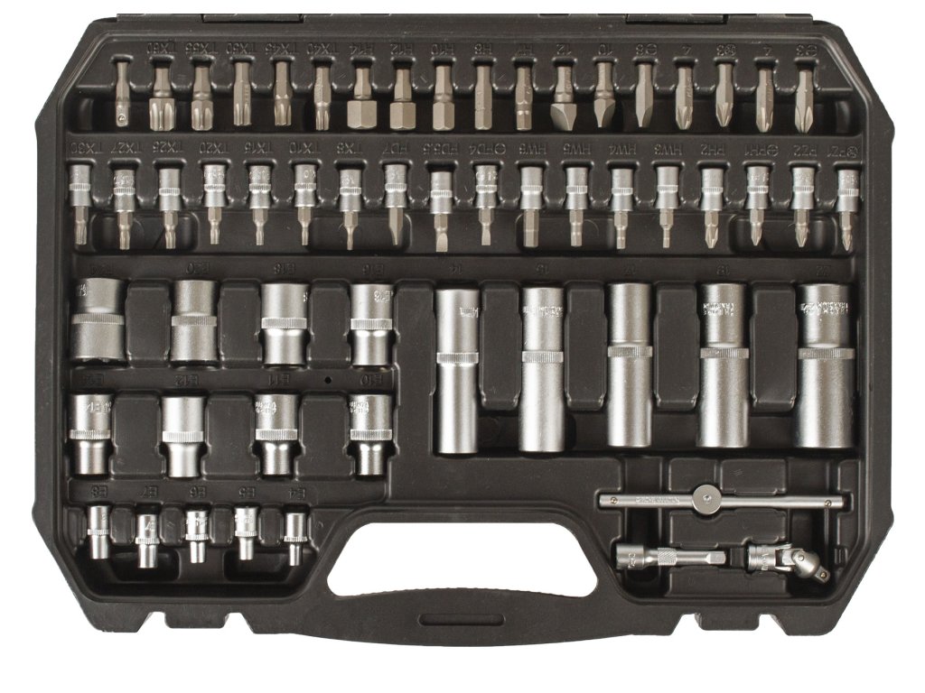V sadě naleznete nástrčné klíče pro ráčny 1/4" a 1/2" o velikostech 4 až 32 mm, dále TORX, HEX, ploché, křížové bity a další příslušenství.