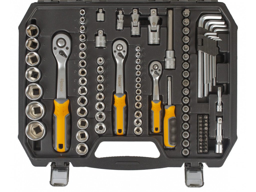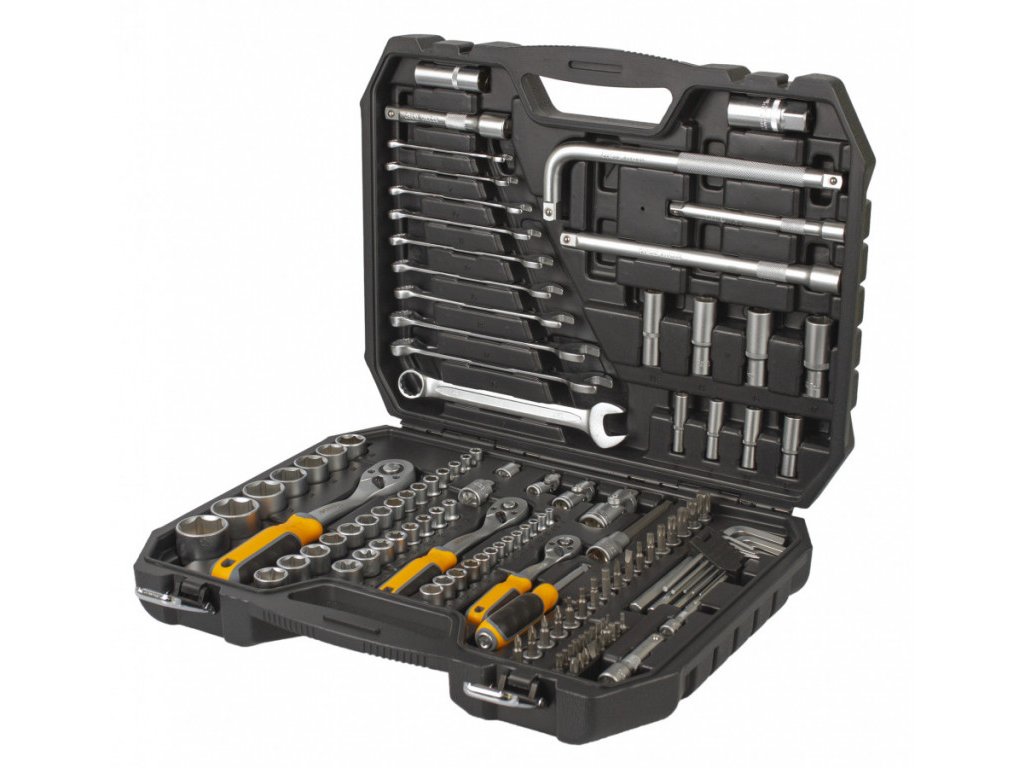 Sada obsahuje ráčny 1/4", 3/8" a 1/2", nástrčné klíče, prodloužení, kardanové klouby, očkoploché klíče a mnoho dalšího.