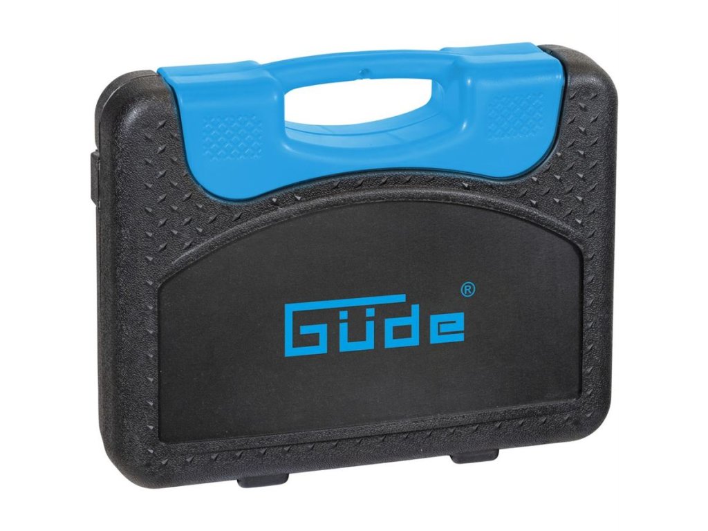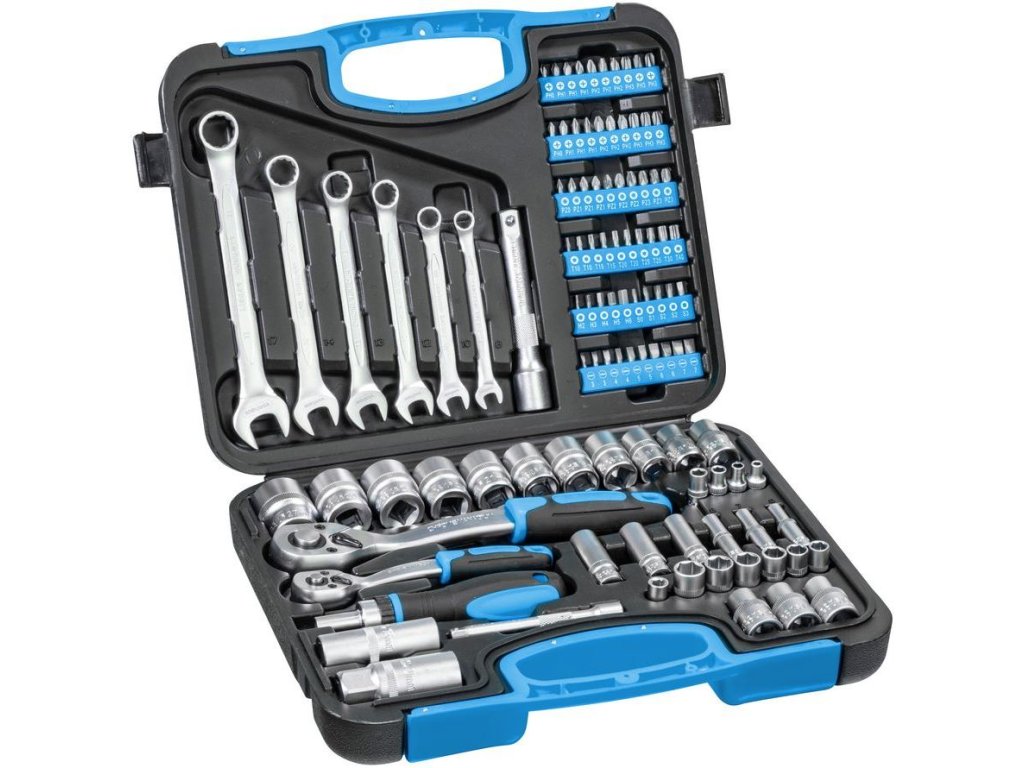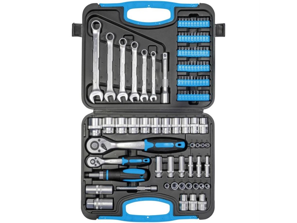 Sada nářadí v praktickém plastovém kufříku zahrnuje 2 ráčny (1/2" a 1/4" se 72 zuby) s prodlouženími a nástrčkovými klíči, široký sortiment bitů, bitový šroubovák s ráčnovou funkcí, potřebné adaptéry, očko-ploché klíče.